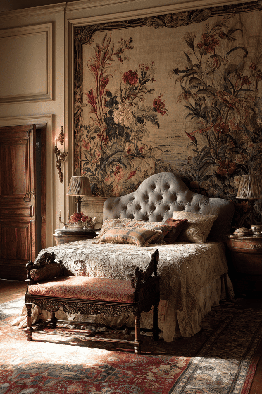 Floral textile accents introduce softness and storytelling into an antique bedroom, adding depth through intricate patterns. Botanical designs create a sense of heritage and artistry. These pieces layer beautifully with carved furniture and metallic finishes. Their muted tones balance ornate décor elements. Whether bold or subtle, they enrich the space. Add floral textures to bring warmth and charm into your antique bedroom.
