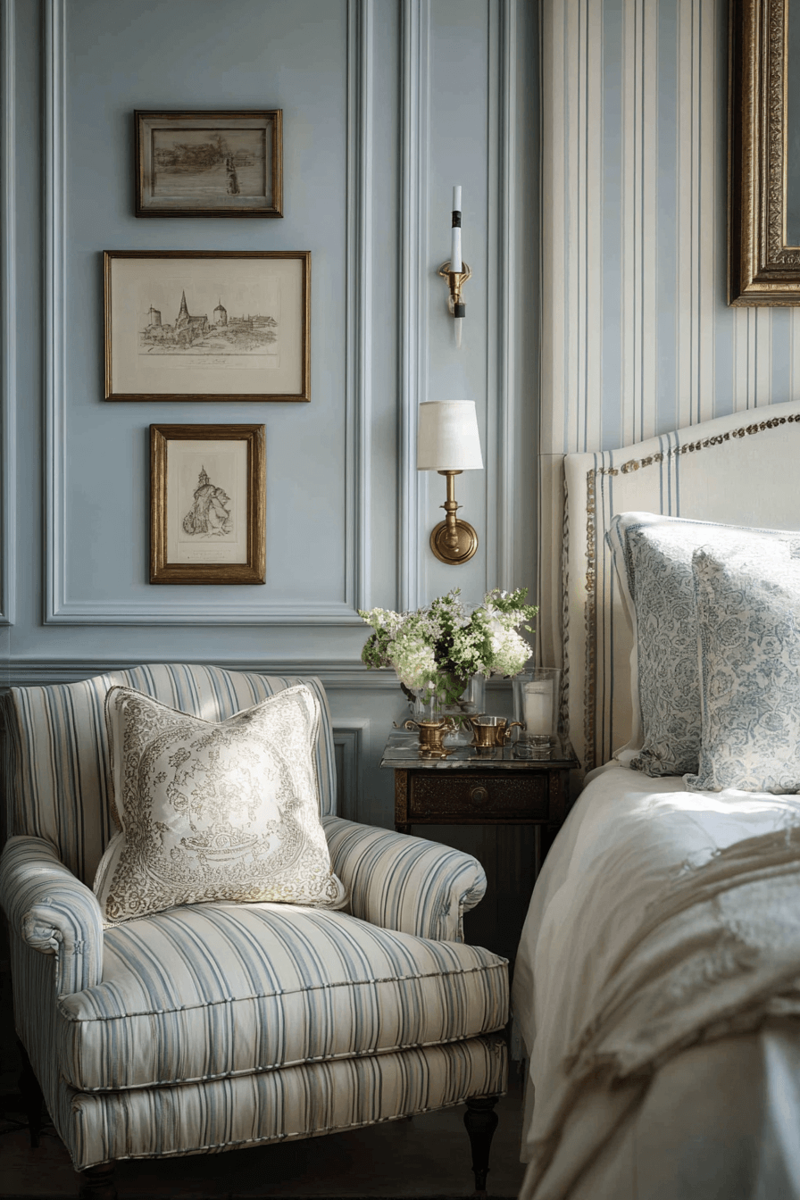 Classic striped upholstery adds subtle structure and elegance to an antique bedroom without overwhelming the design. Soft vertical patterns create a sense of height and balance. This look works well on chairs, headboards, and accent pieces. It pairs effortlessly with wood finishes and traditional décor. The clean lines balance more detailed elements. Refresh your antique bedroom with stripes that feel timeless and refined.