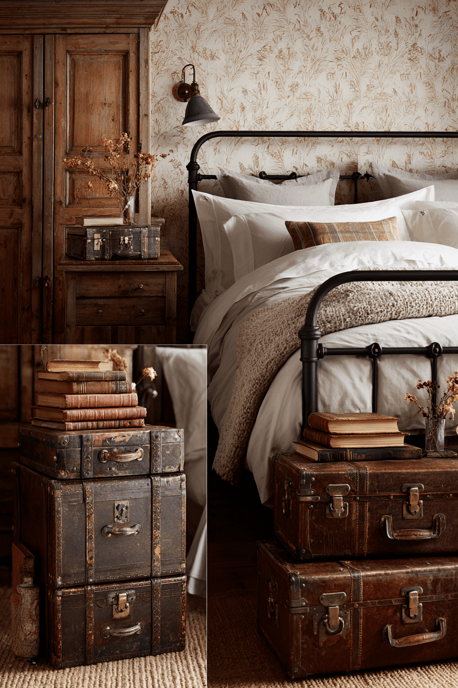Vintage trunk-style nightstands add both charm and practicality to an antique bedroom, bringing a collected feel. Their aged finishes and metal accents create character. These pieces feel unique and intentional. They pair beautifully with soft bedding and layered textiles. Their storage function adds everyday convenience. Style your antique bedroom with nightstands that feel both functional and nostalgic.