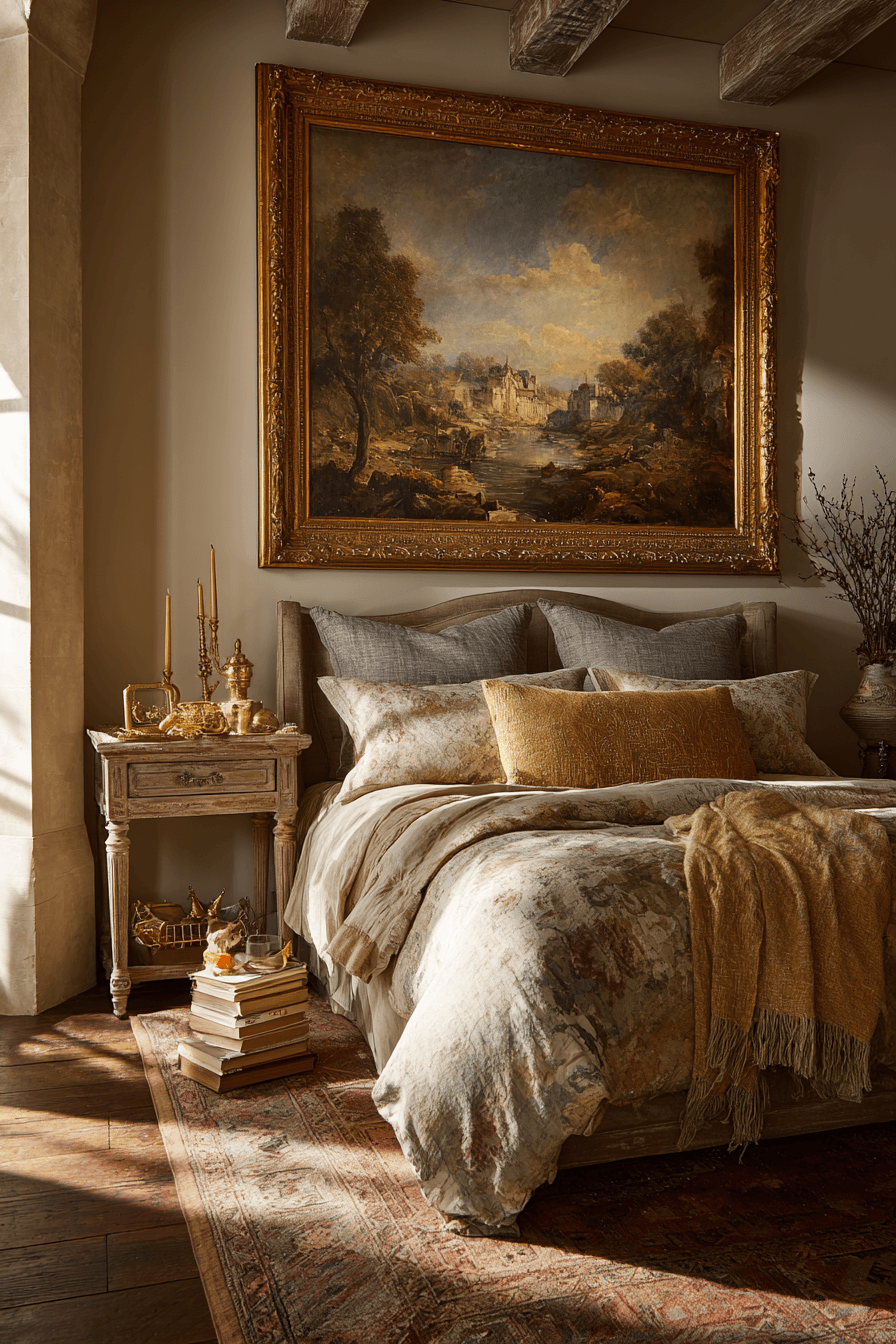 Classic artwork above the bed creates a strong focal point in an antique bedroom, adding sophistication and balance. Landscapes or portraits framed in aged finishes bring timeless beauty. This placement anchors the space visually. It pairs beautifully with traditional furnishings. The design feels layered and refined. Add artwork that gives your antique bedroom a polished finish.
