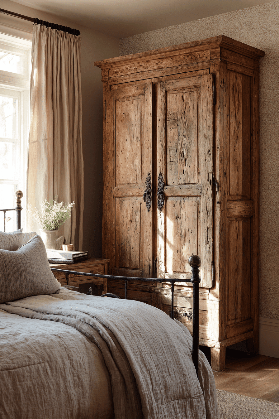 Rustic armoires add bold presence and storage to an antique bedroom, becoming standout pieces. Their carved details and aged finishes highlight craftsmanship. These pieces act as functional focal points. Paired with softer textures, they create balance. The overall look feels warm and inviting. Choose an armoire that adds both beauty and utility to your antique bedroom.