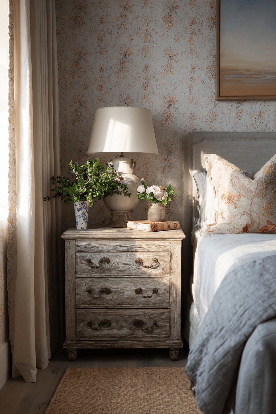 Distressed bedside pieces add personality and warmth to an antique bedroom, creating a lived-in feel. Their aged finishes and textured wood bring authenticity. These tables combine function with visual appeal. Styled with décor, they enhance coziness. Their imperfections add charm. Complete your antique bedroom with pieces that feel storied and unique.