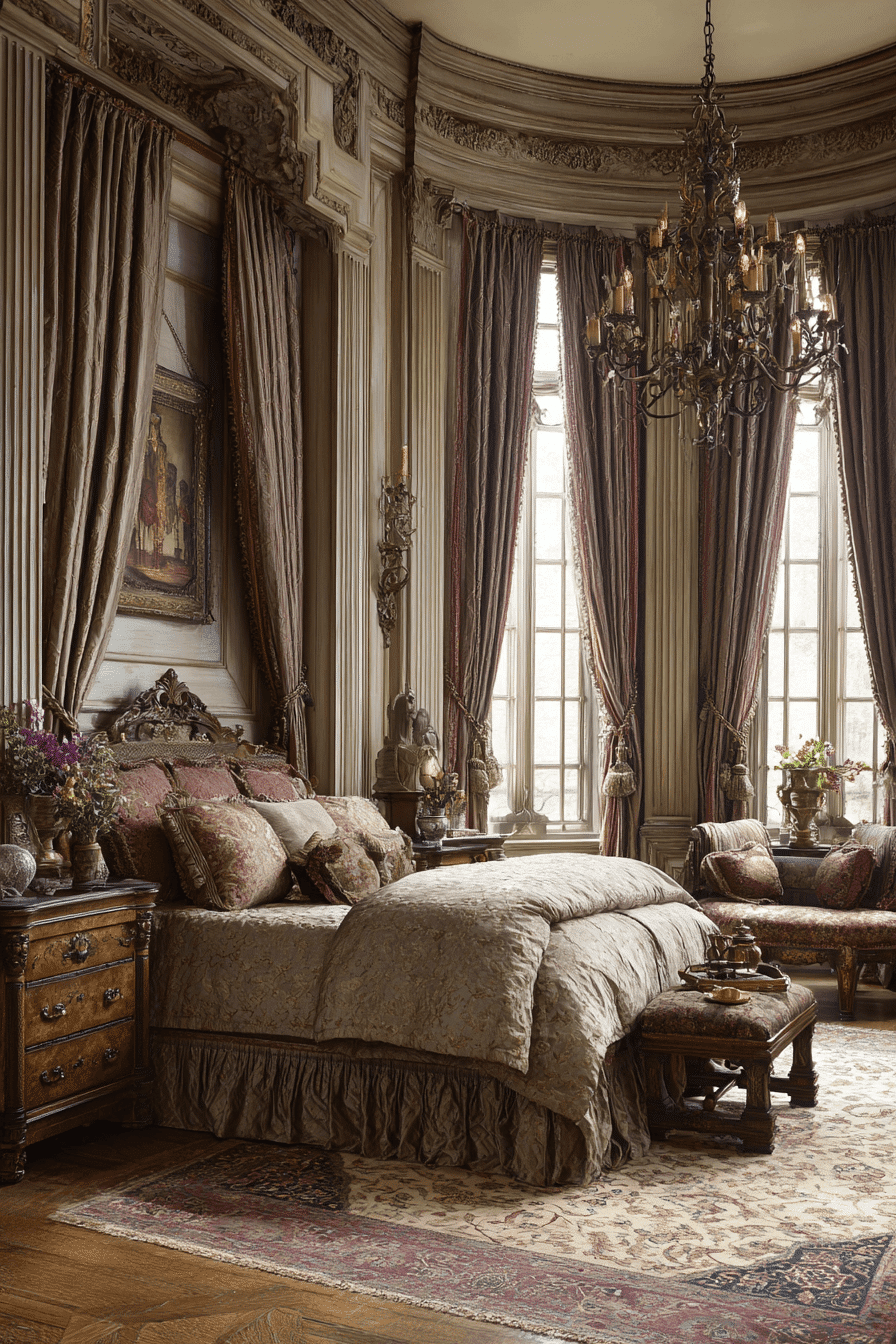 Layered window treatments inspired by Victorian design add richness and softness to an antique bedroom. Luxurious fabrics like velvet and lace create depth while filtering light into a warm glow. These curtains frame windows elegantly and enhance the overall ambiance. Paired with traditional furnishings, they create a space that feels timeless. They also provide comfort and insulation. Dress your antique bedroom with drapery that feels both grand and inviting.