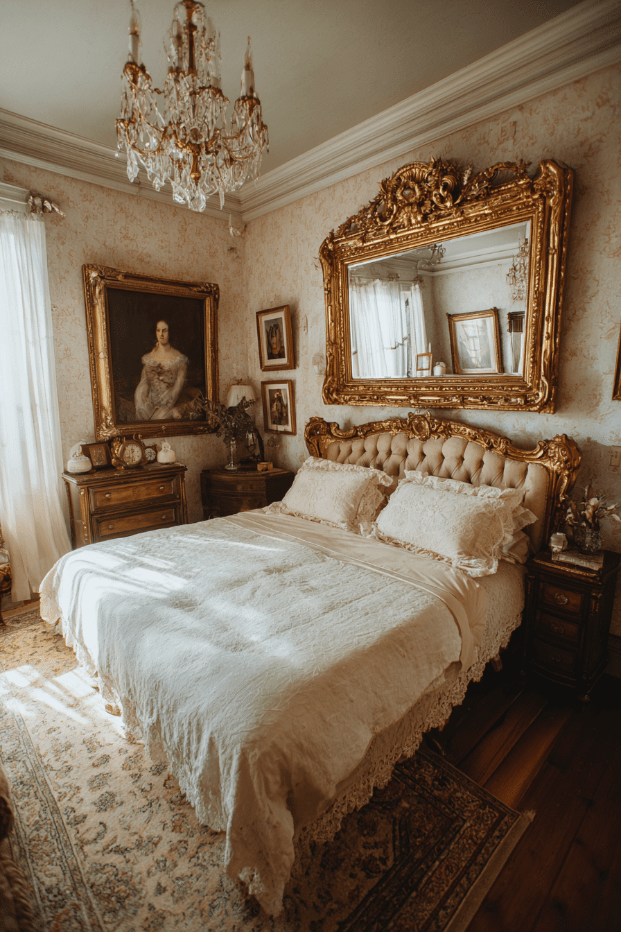 Decorative gold-framed mirrors bring light and sophistication into an antique bedroom, creating a sense of openness and luxury. Their intricate detailing and softly aged finishes add warmth and refinement. Positioned above furniture, they naturally draw attention without overpowering the space. These mirrors complement velvet textures, carved wood, and classic lighting beautifully. Their reflective surfaces enhance depth and dimension. Add a mirror that brings a radiant glow to your antique bedroom.
