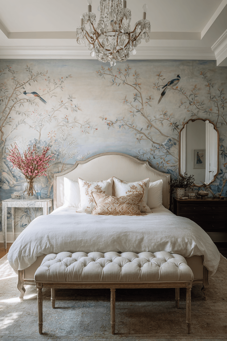 Artistic chinoiserie wall designs add storytelling and visual interest to an antique bedroom, creating a unique focal backdrop. Delicate motifs featuring birds, florals, and scenic elements bring elegance into the space. Whether applied through wallpaper or painted detail, they instantly stand out. Paired with classic furnishings, they create a refined and collected look. Soft colors maintain a calming effect. Introduce chinoiserie elements to give your antique bedroom a distinctive charm.