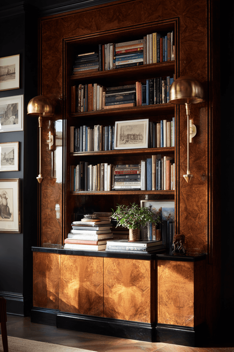 Deco-inspired shelving introduces geometric elegance into an antique bookshelf, blending vintage charm with sleek structure. Clean lines and bold shapes create a polished appearance. Dark finishes add depth and sophistication. This style pairs well with metallic accents and curated décor. It feels modern yet rooted in classic design. Elevate your antique bookshelf with a Deco-inspired touch.