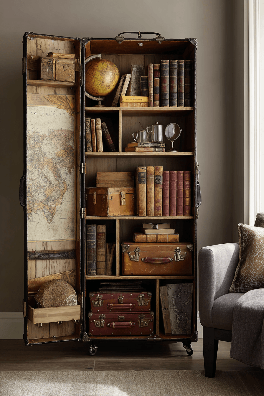 Repurposed trunk shelving brings creativity and storytelling into an antique bookshelf, combining storage with personality. Vintage materials like leather and metal add character. The design feels unique and adventurous. Compact sizing makes it perfect for smaller spaces. Each piece tells its own story. Style your antique bookshelf with a design that feels truly one-of-a-kind.