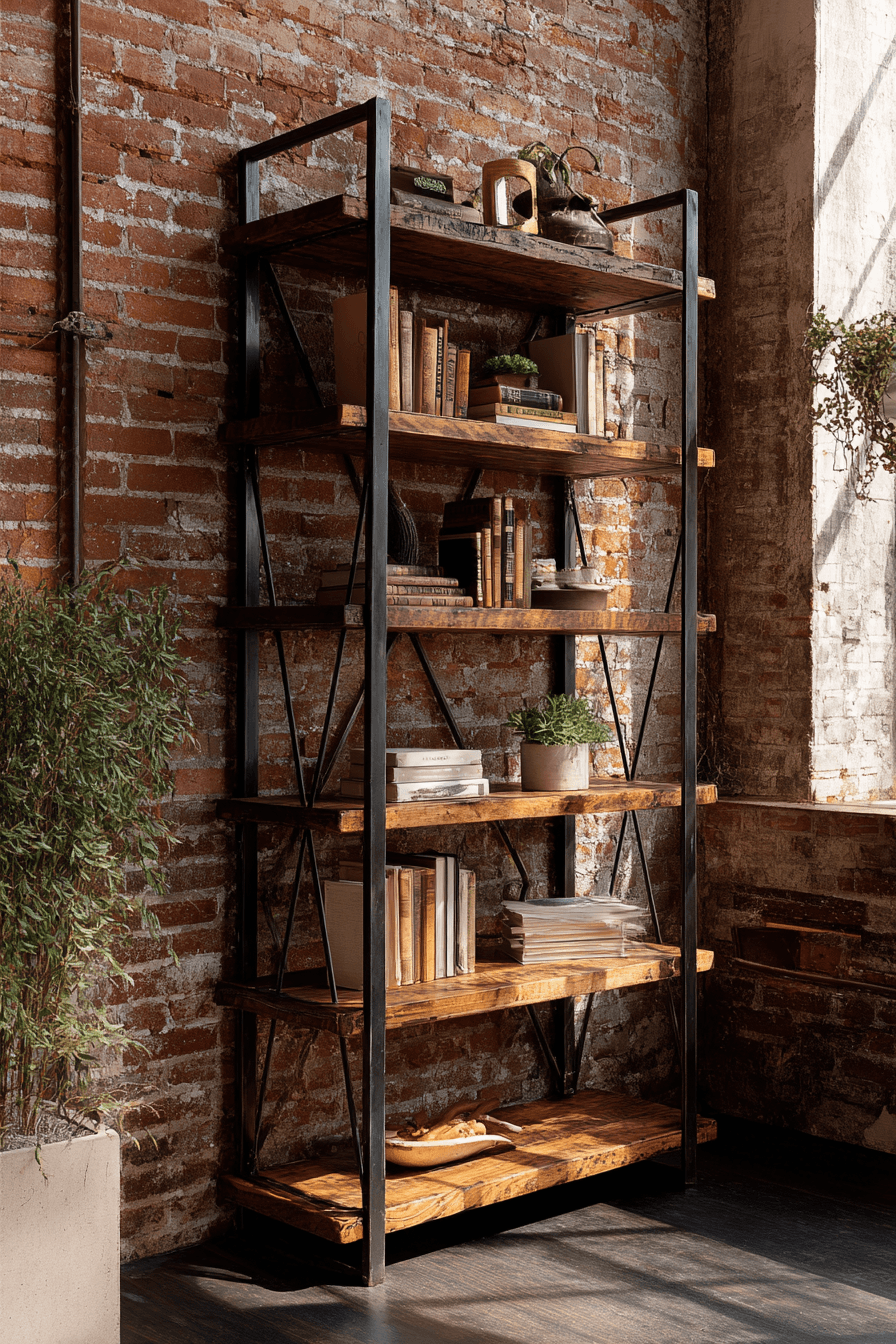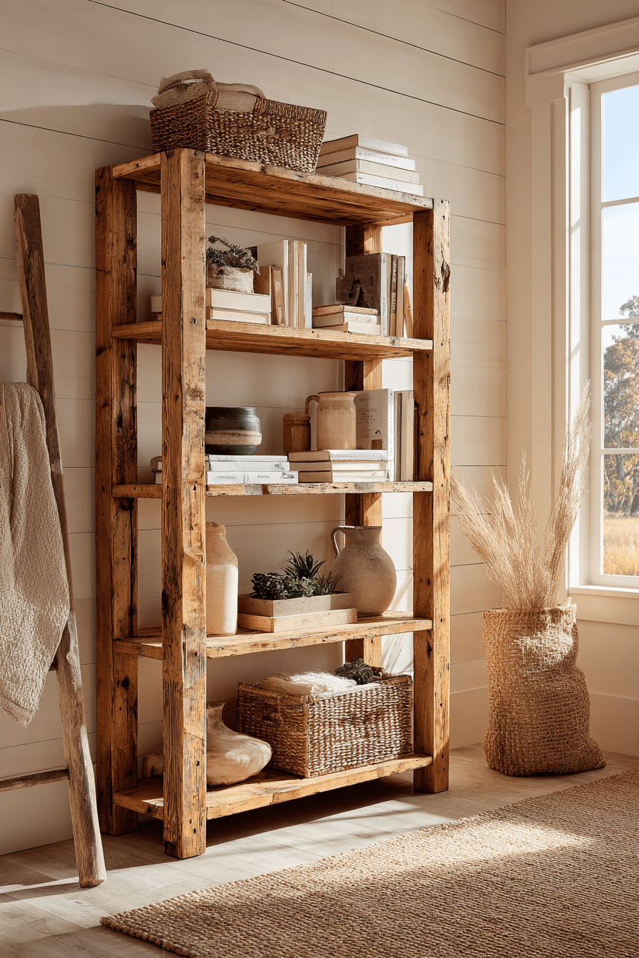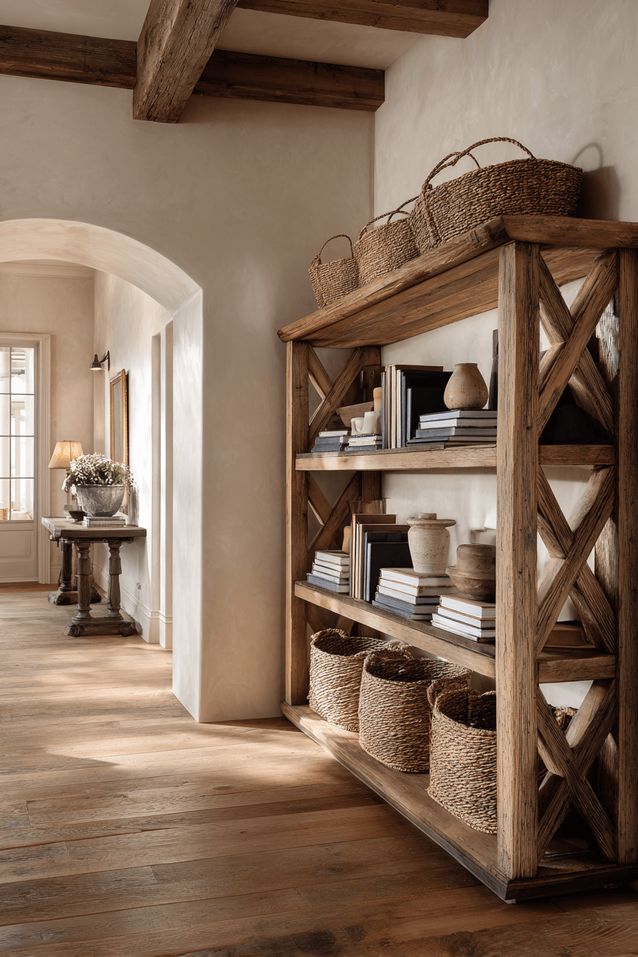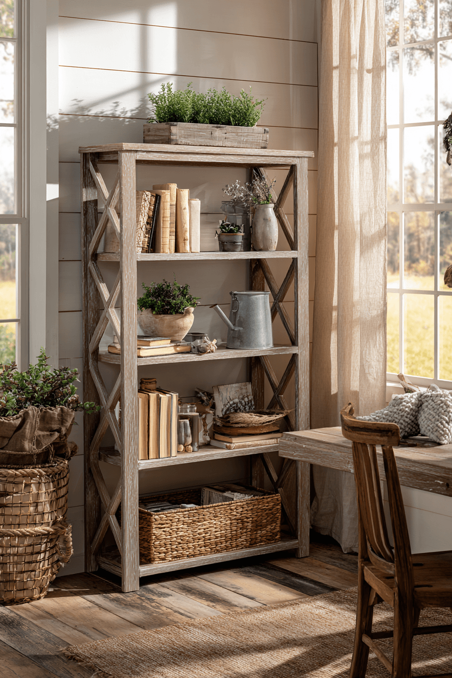 Open farmhouse shelving creates a relaxed and airy feel for an antique bookshelf, blending rustic charm with simplicity. Exposed wood and cross-bracing add structure. The open design keeps the space feeling light. It’s ideal for displaying books and decorative accents. This style works well in open layouts. Bring farmhouse warmth into your antique bookshelf styling.