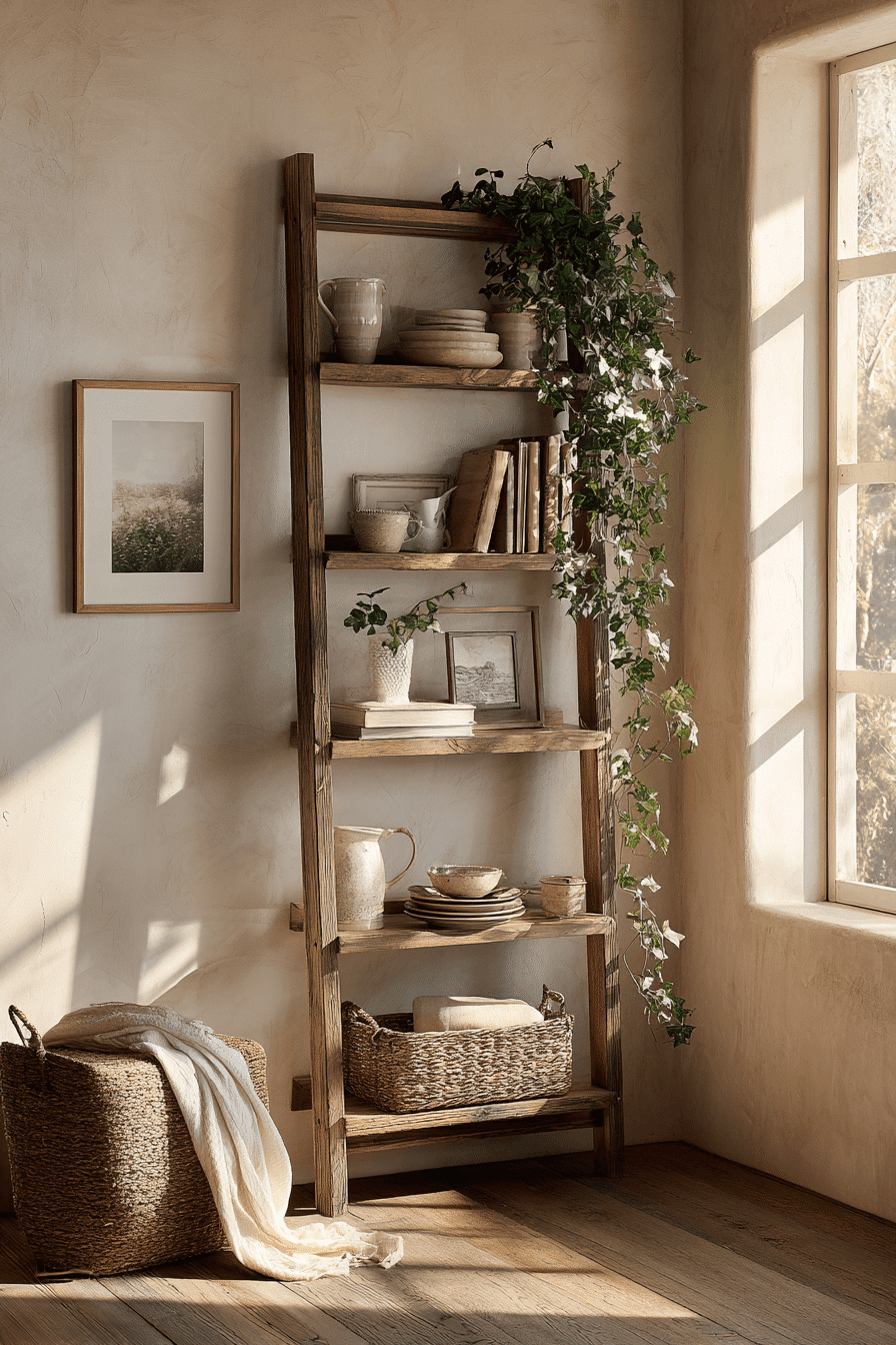 An angled ladder design offers a casual and practical take on an antique bookshelf, blending simplicity with charm. Its open structure keeps the display light and approachable. Worn textures add a collected, lived-in feel. The shelves are ideal for layering books, plants, and décor. This style fits easily into eclectic or rustic interiors. Style your antique bookshelf with a ladder design that feels relaxed and effortless.