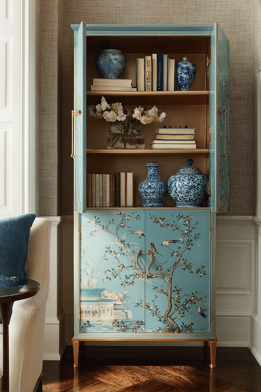 Chinoiserie cabinets bring artistic flair into an antique bookshelf, turning it into a decorative focal point. Hand-painted motifs add storytelling and visual depth. Lacquered finishes and metallic accents enhance elegance. This design offers both display and storage options. It feels curated and unique. Make your antique bookshelf a work of art with chinoiserie styling.