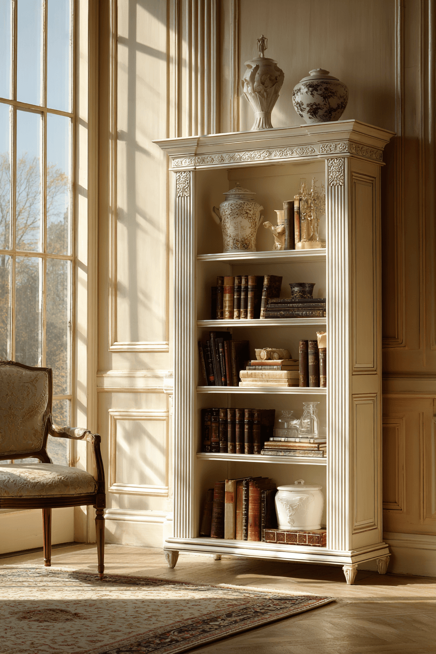 Fluted neoclassical shelving adds structure and symmetry to an antique bookshelf, creating a refined architectural look. Vertical lines enhance height and elegance. The understated design allows décor to stand out. It works well across various interiors. The look feels balanced and timeless. Enhance your antique bookshelf with sculptural fluted details.