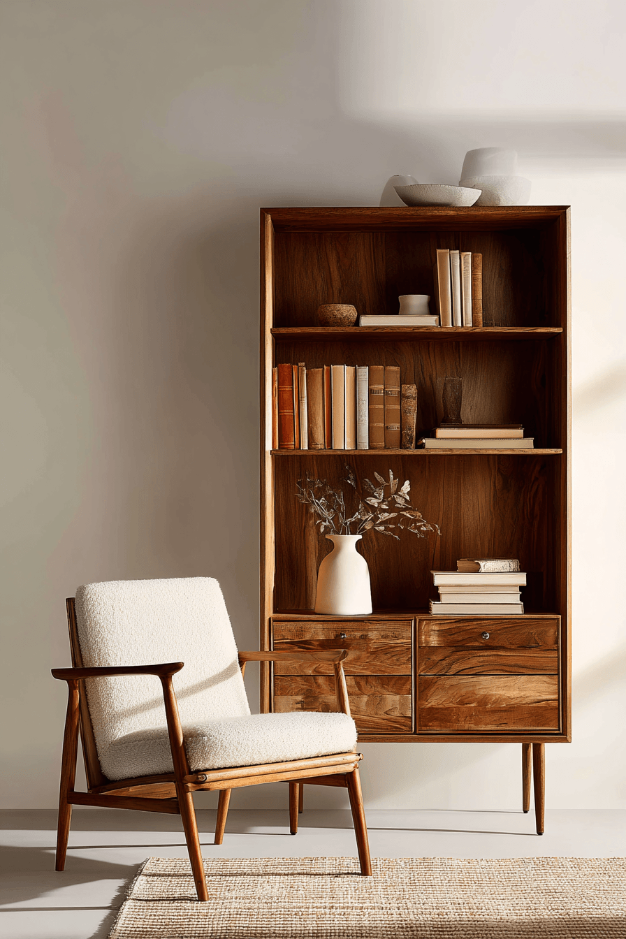 Mid-century fusion shelving blends vintage warmth with modern simplicity in an antique bookshelf, creating a fresh and balanced look. Clean lines and tapered legs add structure. Warm wood tones bring richness. This design pairs well with mixed décor styles. The result feels curated and unique. Combine past and present with an antique bookshelf that feels effortlessly stylish.