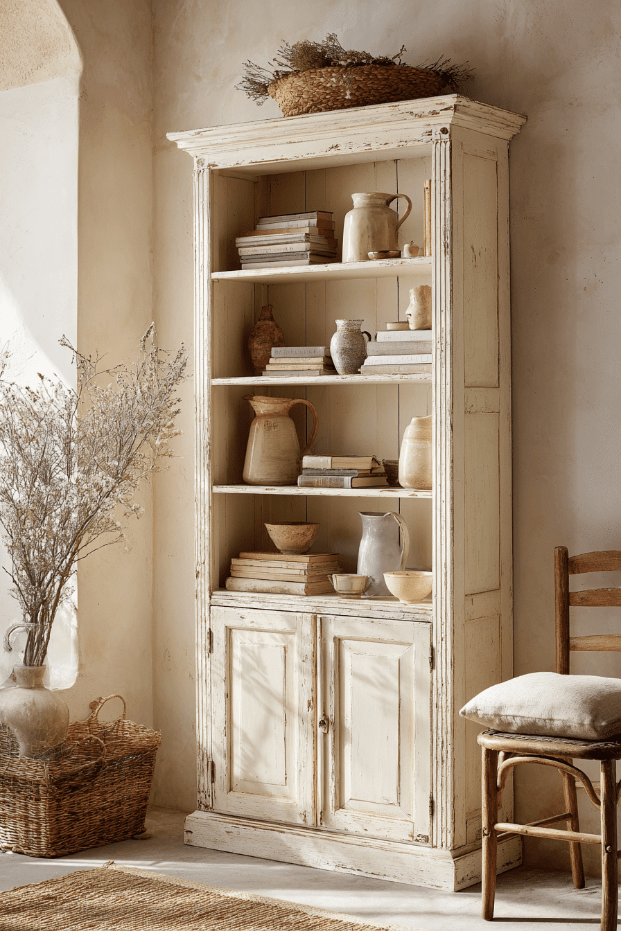 Soft provincial finishes introduce a light, romantic elegance to an antique bookshelf, making the display feel airy and graceful. Curved edges, painted surfaces, and subtle distressing create a relaxed yet refined look. This style pairs beautifully with ceramics, soft linens, and vintage accents. Lighter tones brighten the space while maintaining antique charm. It feels delicate yet practical for everyday styling. Add a provincial-inspired antique bookshelf to bring effortless charm into your home.