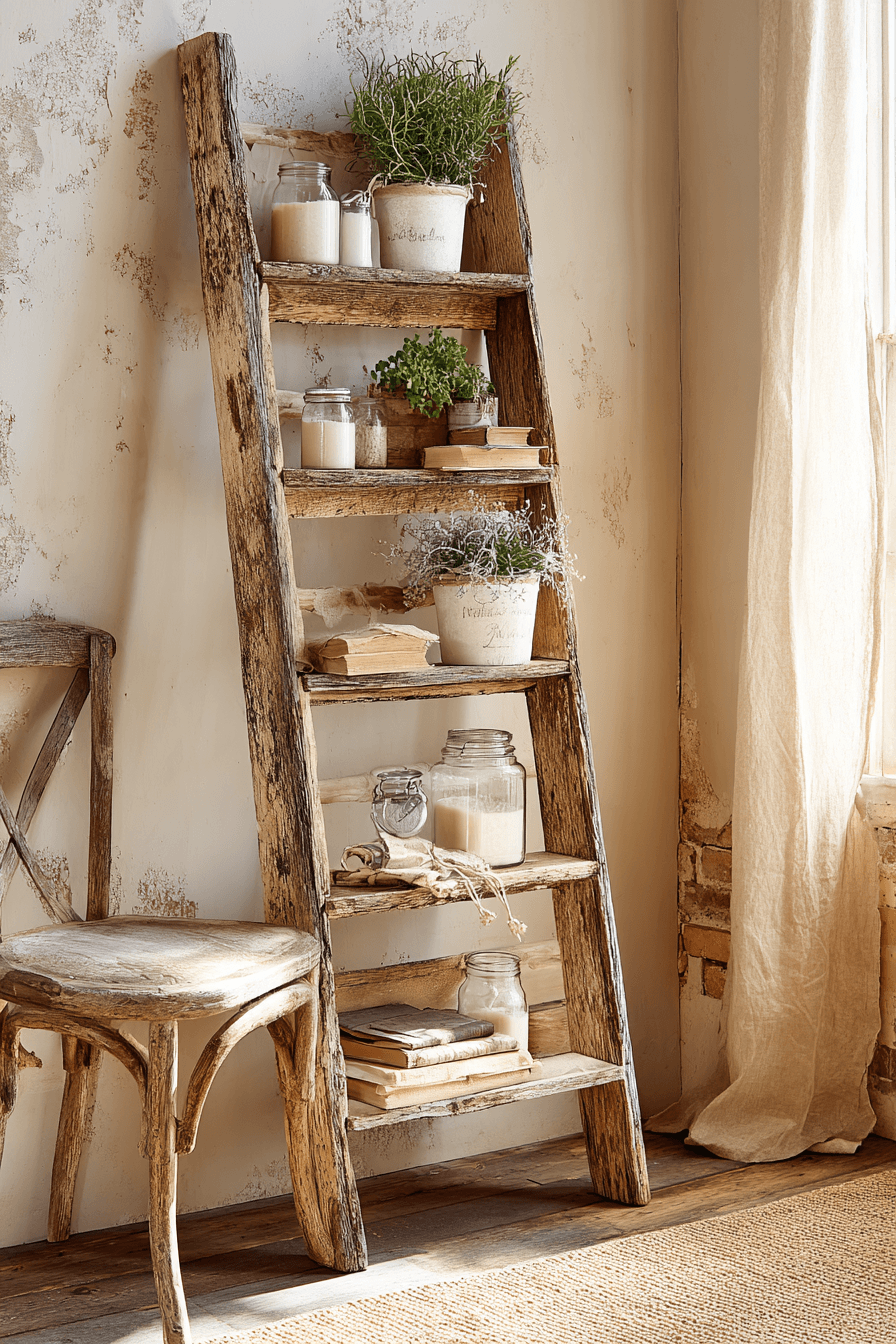 Ladder-back wall shelving adds height and visual interest to an antique bookshelf, creating an open and balanced design. Its vertical structure enhances smaller spaces. Open shelves allow for flexible styling. Weathered finishes add character. The design feels light yet functional. Add vertical charm to your antique bookshelf with this unique style.