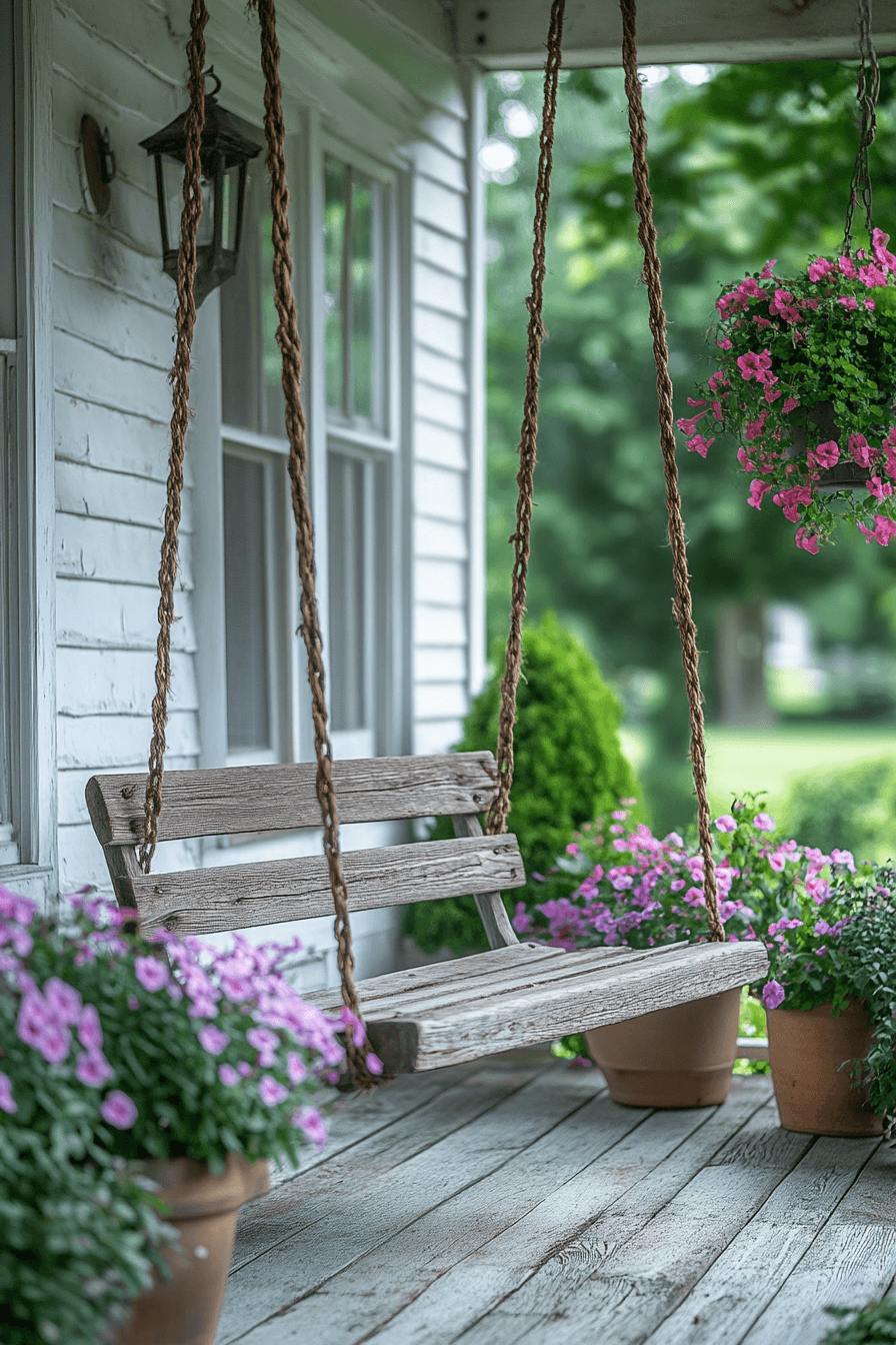 A porch swing layered with soft cushions and vintage paint instantly captures nostalgic comfort. As one of the most joyful antique farmhouse decor ideas, it invites slow mornings and sunset reflections. The gentle sway creates moments of peace and contentment. Its timeless design feels both familiar and special.