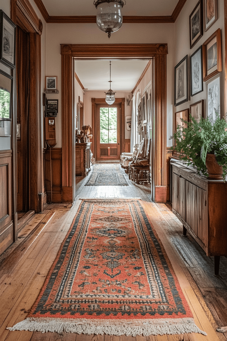 A hallway runner woven with vintage patterns adds character to every step. It’s one of the most effortless antique farmhouse decor ideas for turning plain corridors into warm paths of charm. The faded colors and classic motifs feel rich with history. Every footstep echoes stories of the past.