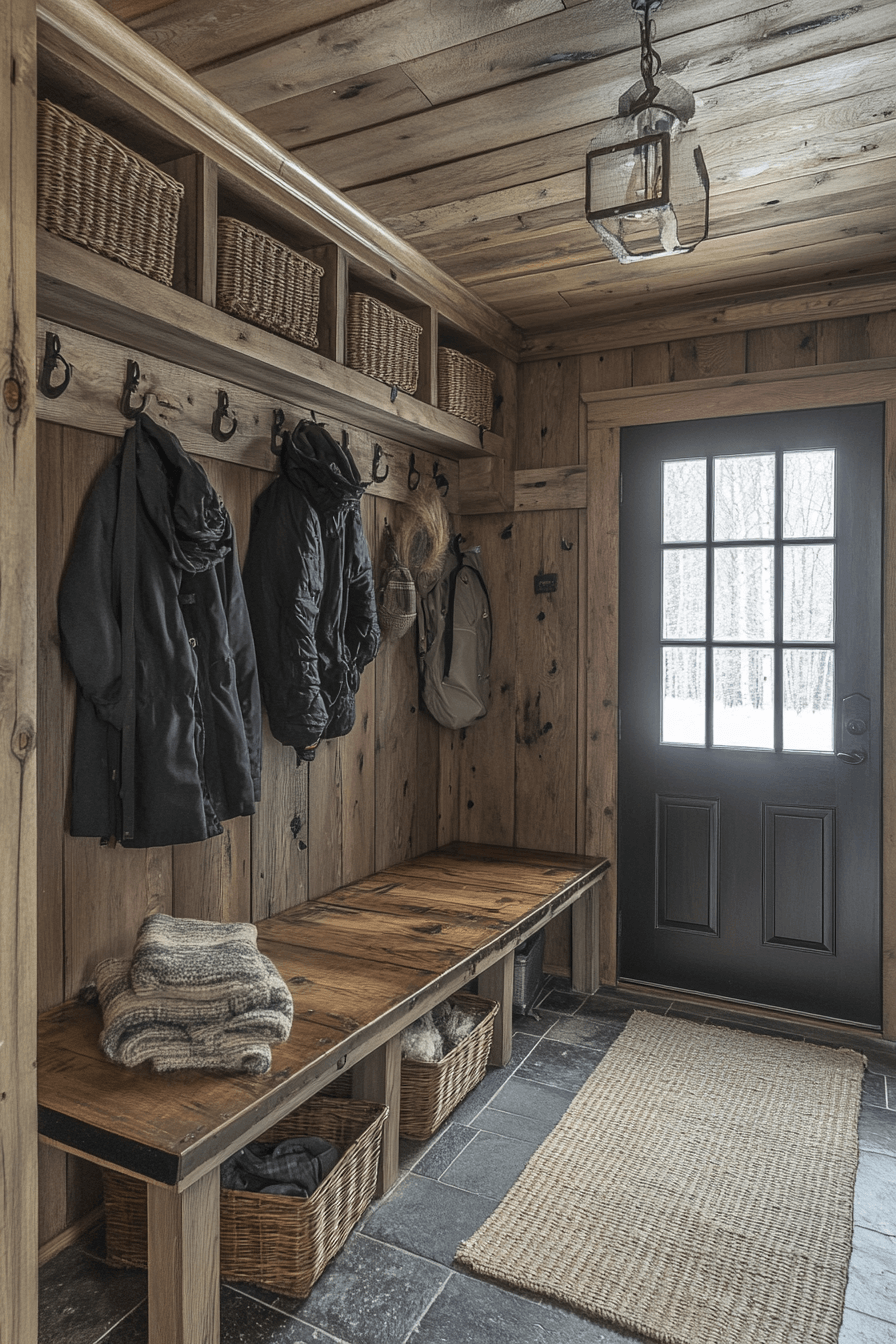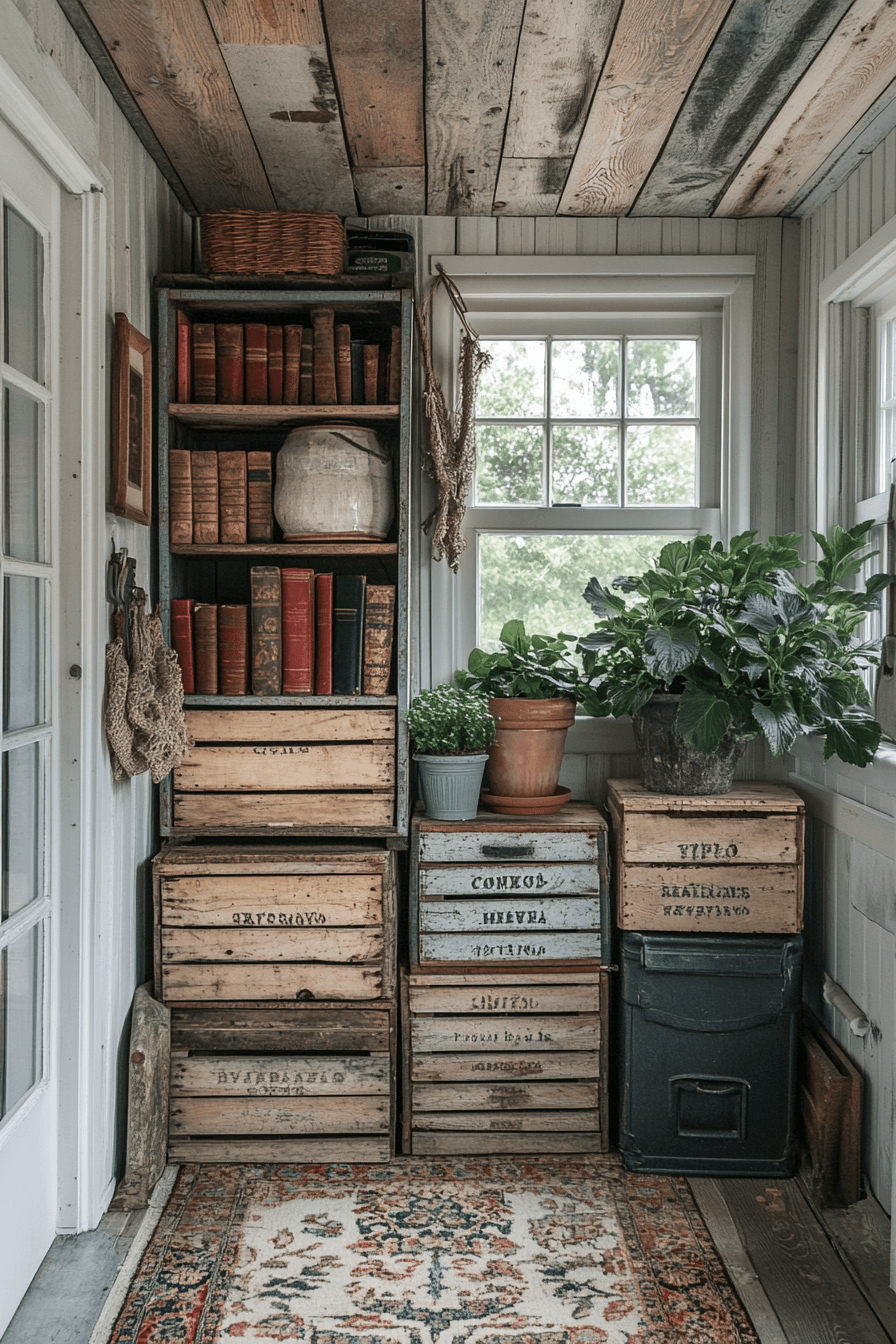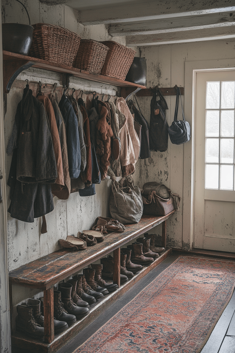 A vintage mudroom full of handcrafted storage feels equal parts cozy and practical. As one of the most authentic antique farmhouse decor ideas, it transforms utility into artistry. Worn wood, brass hooks, and soft light make everyday living special. Every detail feels handcrafted and meaningful.