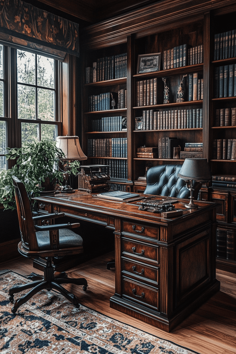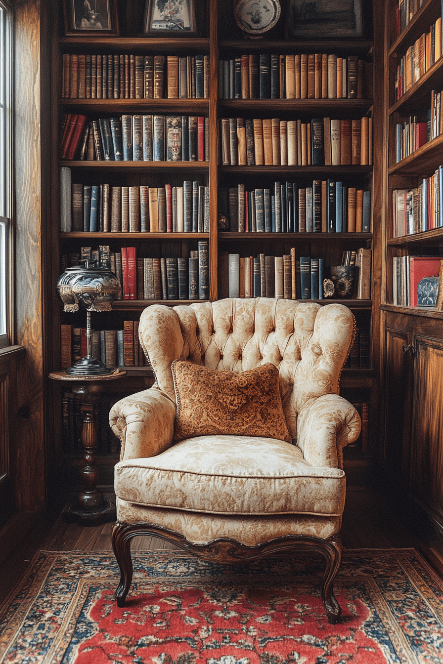 A library with aged books and dark wood shelving feels like stepping into another time. It’s one of the most romantic antique farmhouse decor ideas for dreamers and readers alike. The scent of leather and parchment fills the air with nostalgia. The calm it brings is unmatched.