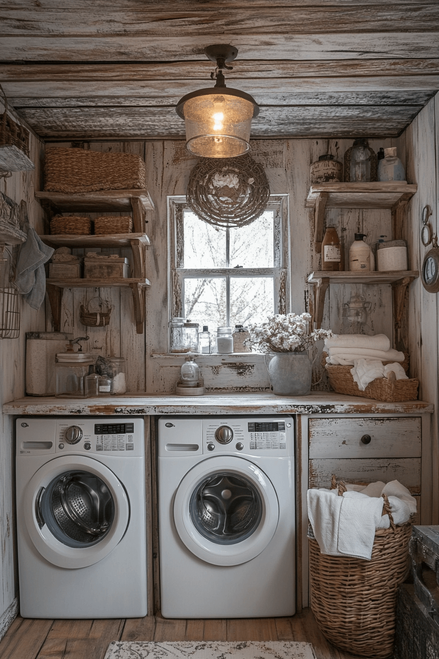 A laundry area with old washboards and distressed shelving turns chores into a charming ritual. It’s one of the most delightful antique farmhouse decor ideas for everyday living. The textures of wood and metal create a tactile sense of history. Even simple routines feel special here.