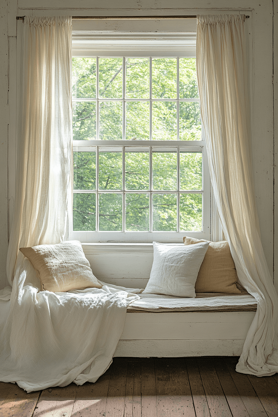 Soft linen curtains and vintage shutters filter sunlight with timeless grace. These classic details remain key to authentic antique farmhouse decor ideas. Their gentle folds and textures evoke cozy calm throughout the home. They’re small touches that make a big difference.