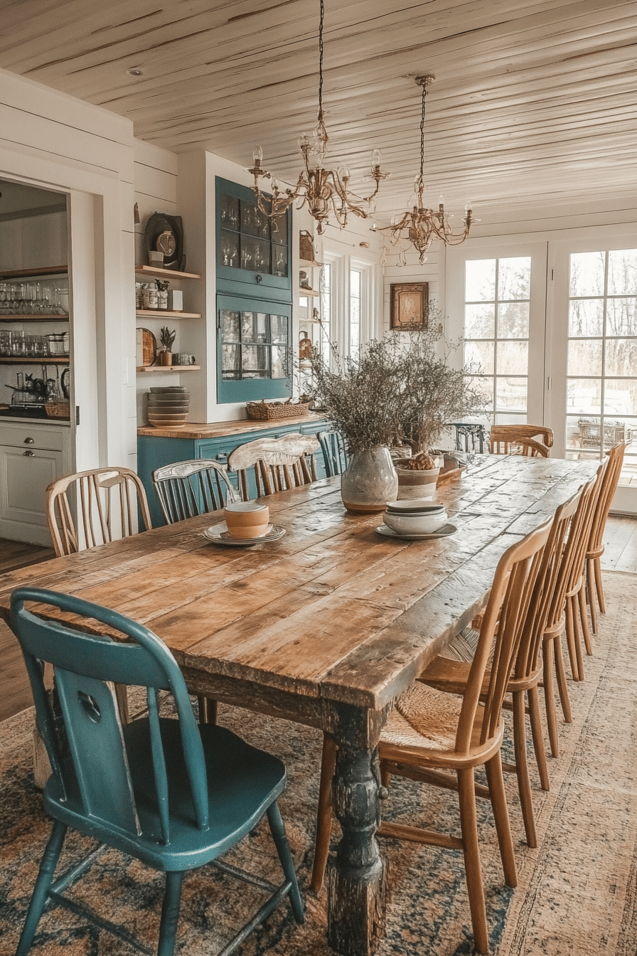 A rustic dining setup with a weathered table and mismatched wooden chairs captures the essence of authentic living. It’s one of the most heartwarming antique farmhouse decor ideas that celebrate family and connection. The imperfections in the wood add personality, turning each meal into a cherished memory. Soft candlelight and simple linens complete the vintage charm.