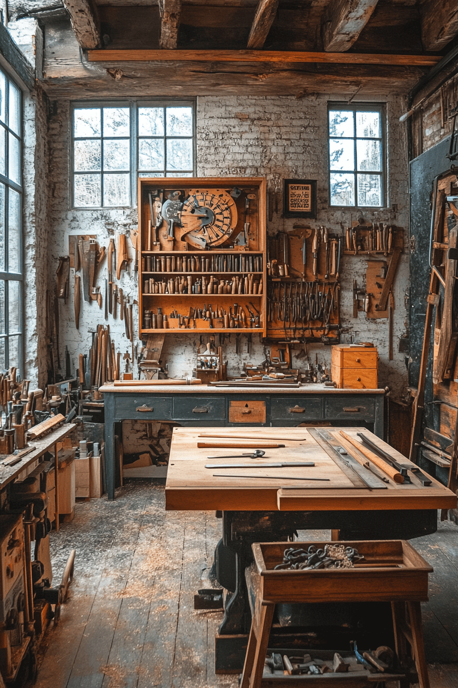 Handcrafted tools and wooden shelves bring history alive in a creative workshop. These antique farmhouse decor ideas celebrate craft, patience, and artistry. The aged finishes and textures give the space authenticity and heart. It’s where creation meets tradition.