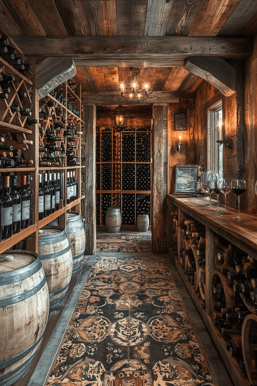 Wine barrels and reclaimed wood racks bring elegance and warmth to any cellar. These timeless additions top the list of refined antique farmhouse decor ideas. They blend function with sophistication effortlessly. Every bottle and shadow adds depth and story.
