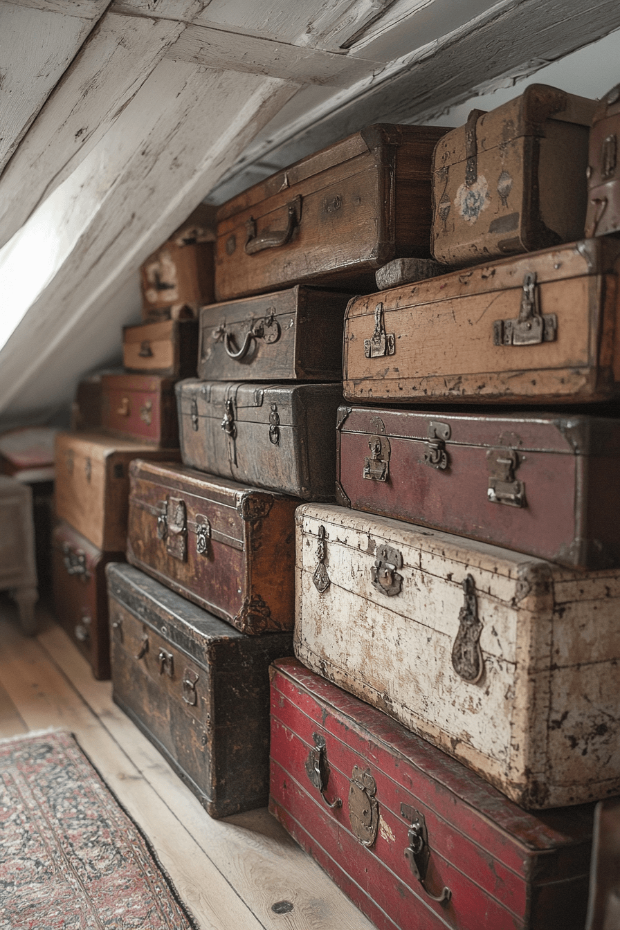 Restored trunks and vintage suitcases add sentimental beauty to any attic hideaway. They remain favorites among antique farmhouse decor ideas that mix storage with storytelling. Each mark and latch whispers tales of travel and time. The charm is quiet but powerful.