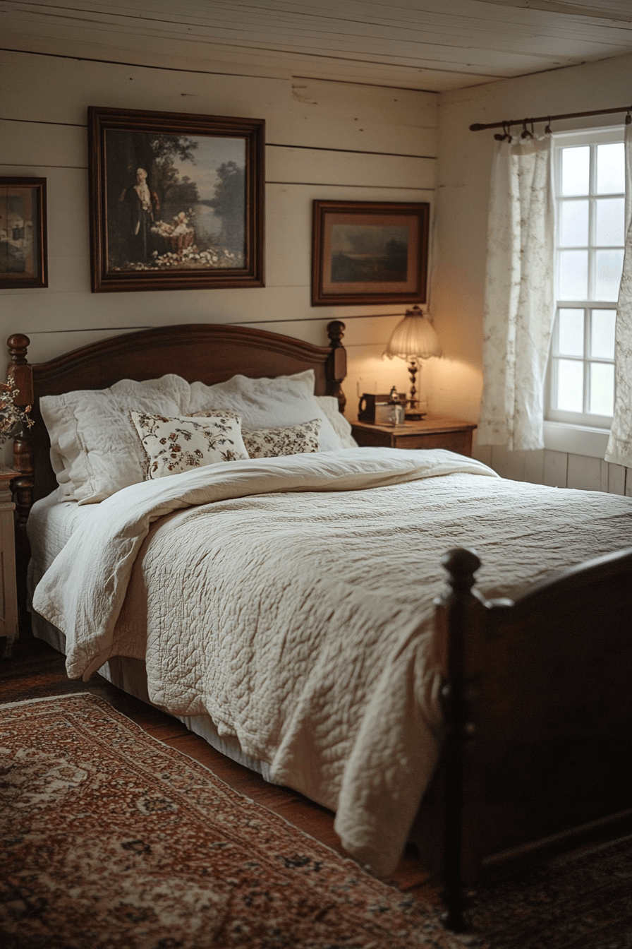 A guest room wrapped in soft quilts and vintage furniture defines cozy hospitality. It’s one of the most inviting antique farmhouse decor ideas for welcoming loved ones in style. The aged textures and gentle lighting set the tone for peace and comfort. Every visitor feels embraced by charm.