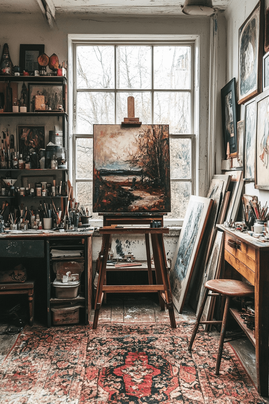 A creative corner adorned with old brushes, easels, and jars of pigment brings heritage to art. Among inspiring antique farmhouse decor ideas, it turns creativity into tradition. The mix of rough wood and aged metal feels both inspiring and grounding. It’s a space for imagination and calm.