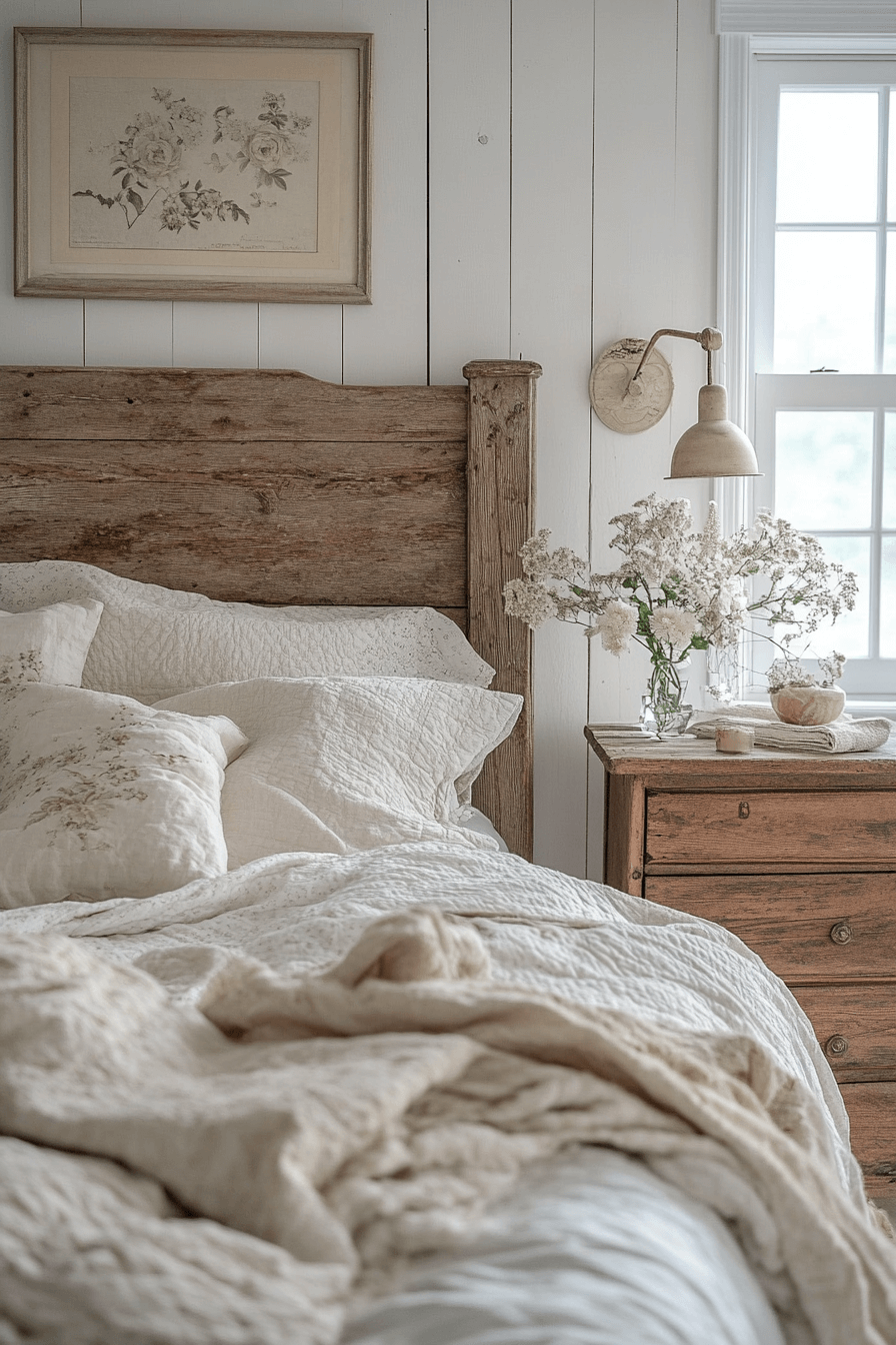 An old farmhouse bedroom evokes peace and history through soft tones and aged textures. It’s one of those antique farmhouse decor ideas that effortlessly blend relaxation and nostalgia. Linen curtains sway gently beside weathered furniture that feels lovingly preserved. The room exudes serenity with every detail.