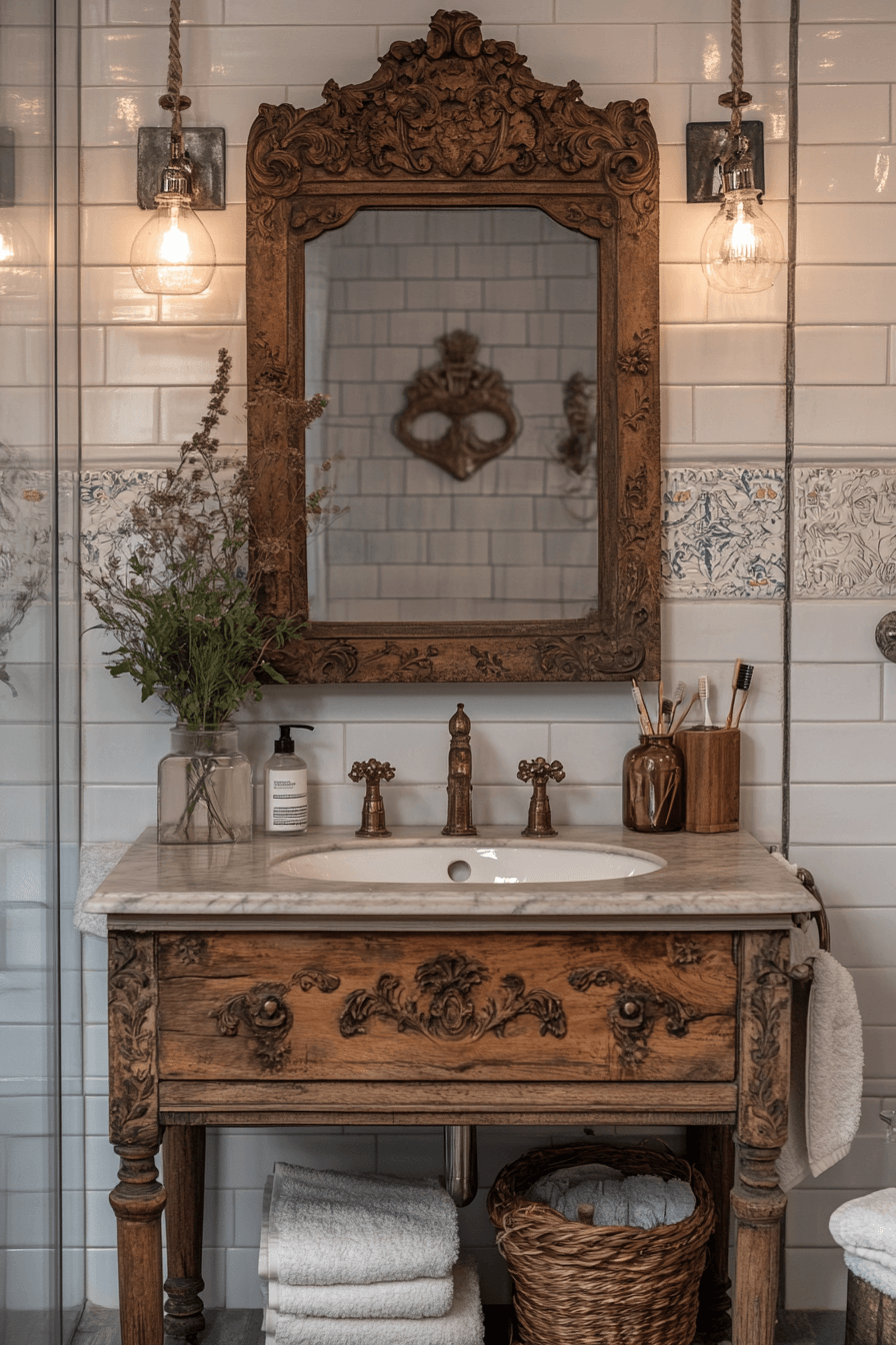 A charming vanity crafted from antique wood becomes the soul of your bathroom’s personality. As one of the most graceful antique farmhouse decor ideas, it adds romance and refinement to daily routines. The patina and carvings create a nostalgic glow that’s hard to replicate. It’s elegance grounded in time-worn beauty.