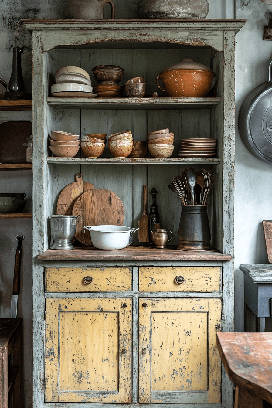 A weathered kitchen cabinet breathes life into your home, telling stories with every faded mark. It’s a signature piece in antique farmhouse decor ideas, combining function with artful imperfection. The texture of aged paint and vintage knobs add character and warmth. It’s not just storage—it’s a statement of soul and simplicity.