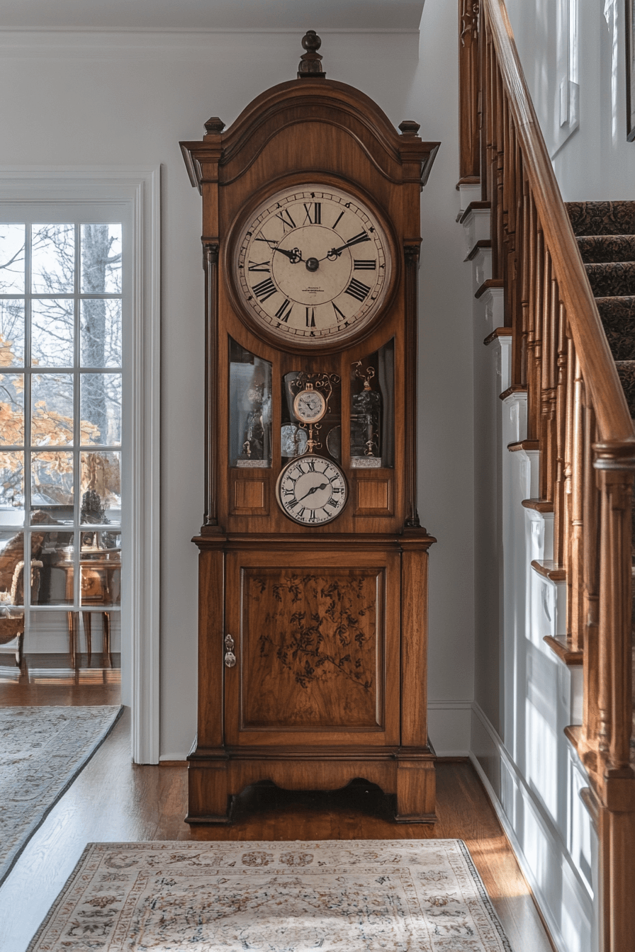 A grand old clock at the entryway sets a poetic rhythm to your home’s first impression. It’s among the most iconic antique farmhouse decor ideas, symbolizing both time and tradition. The steady chime and carved wood frame feel rooted in heritage. It’s elegance that invites reflection and calm.