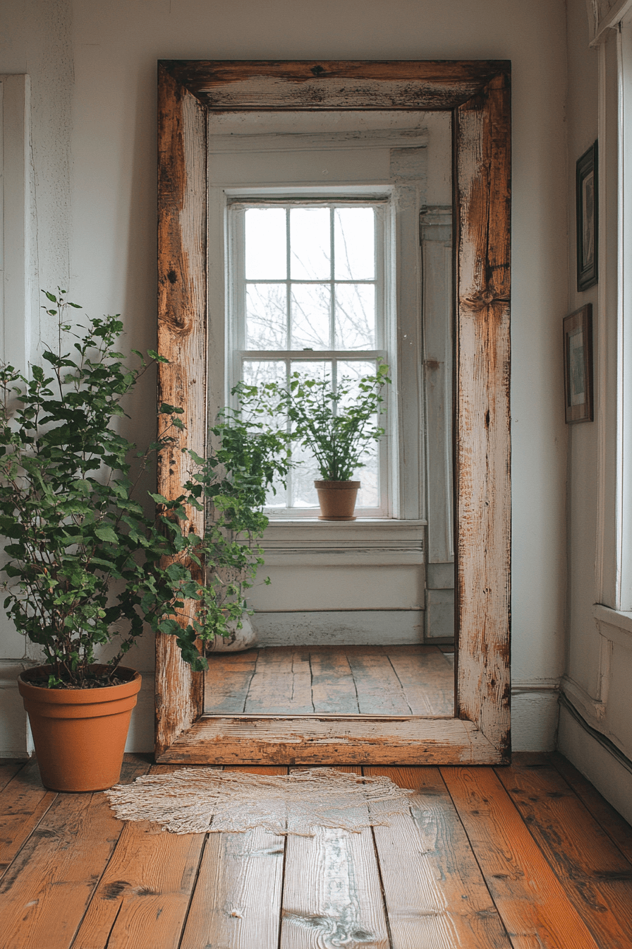 A distressed mirror framed in worn wood instantly brings rustic sparkle to any wall. It stands tall among classic antique farmhouse decor ideas, effortlessly blending function and story. The aged patina adds depth while reflecting light softly throughout the room. Its charm lies in its imperfections.