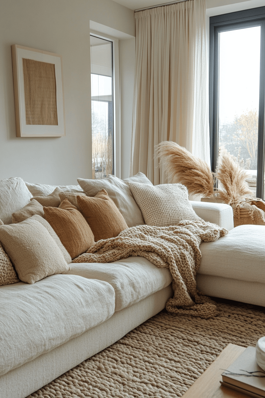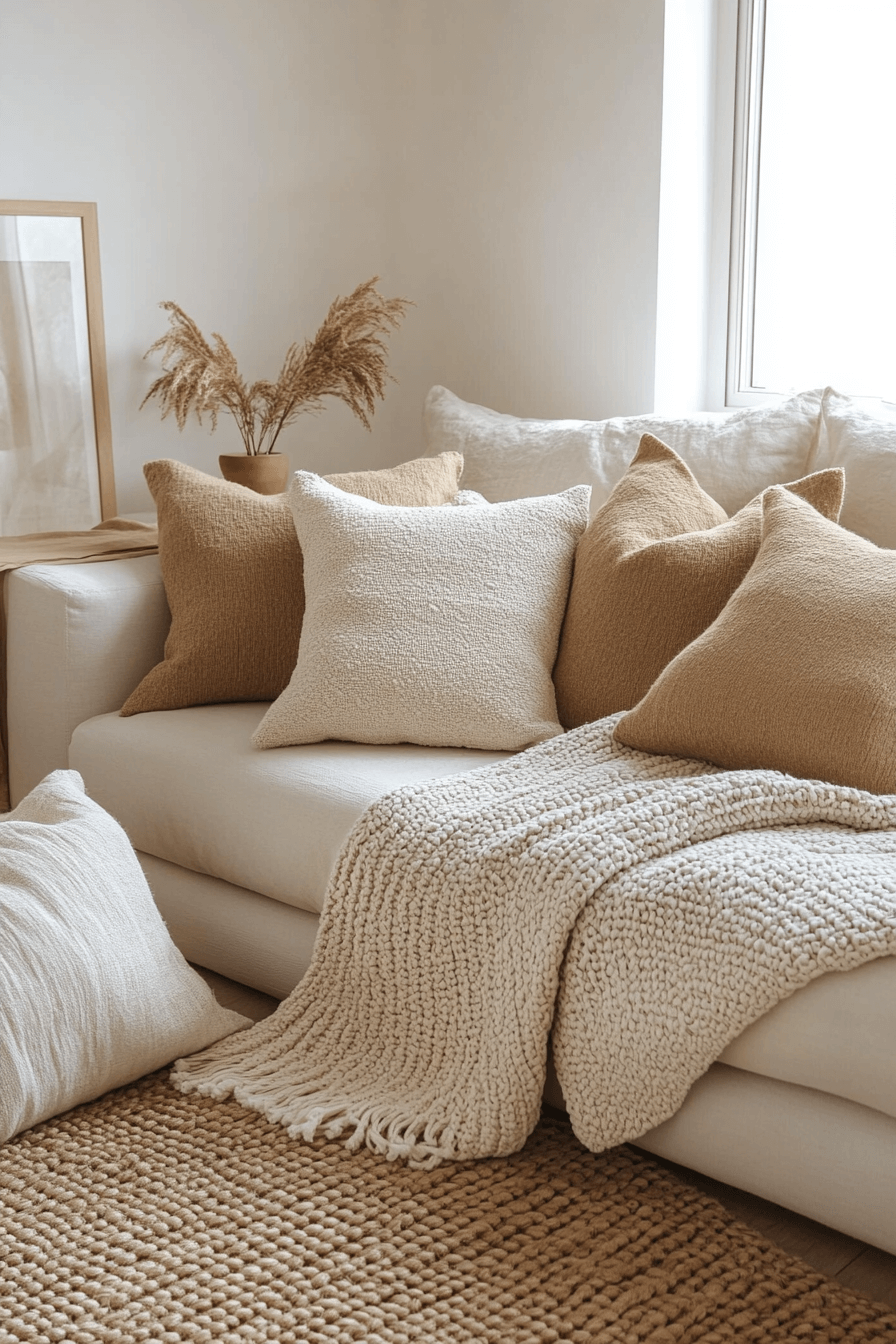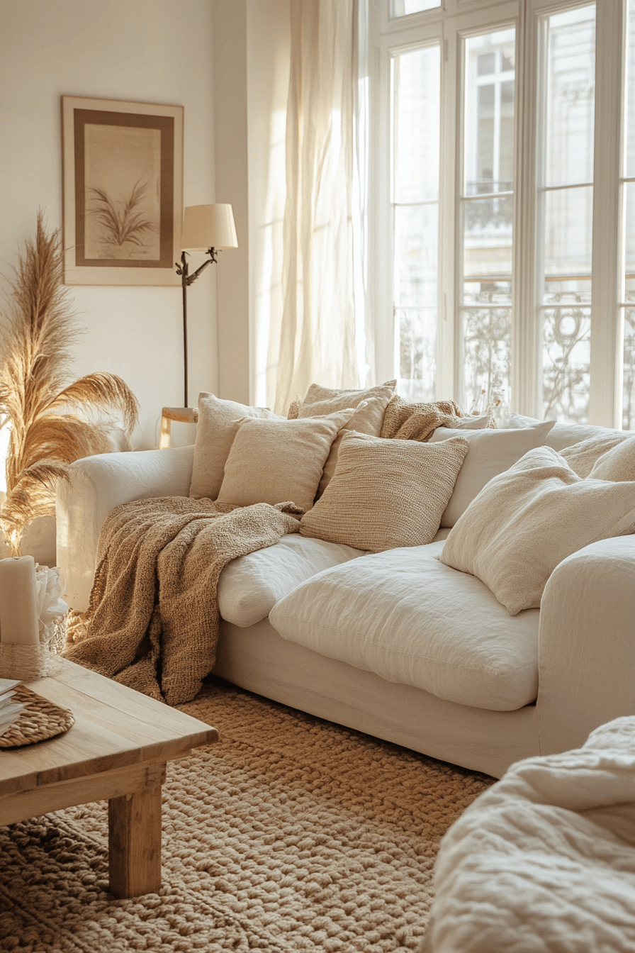 Neutral tones paired with rich textures make any living space feel serene, balanced, and easy to unwind in. The apartment aesthetic cozy style here emphasizes comfort through soft upholstery, tactile throws, and natural woven accents. Light materials ensure the room feels open and airy, while subtle layering adds depth. Minimal yet meaningful design choices keep the look adaptable for years to come.