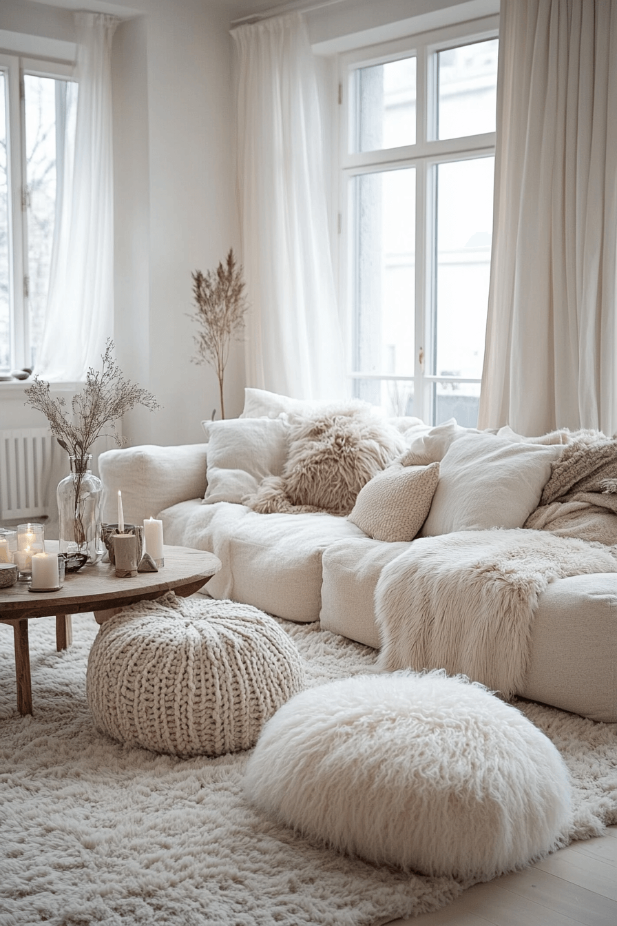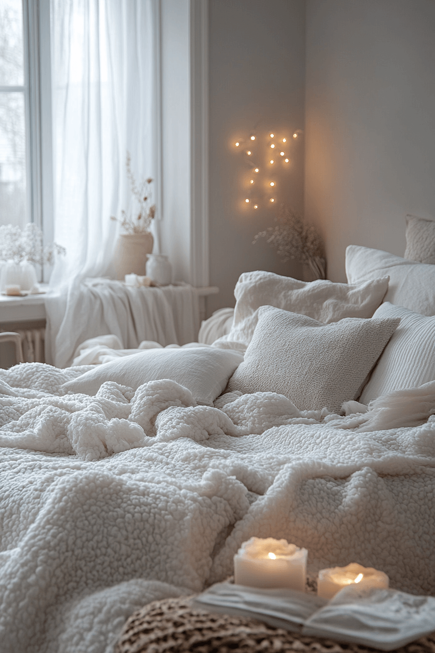 Plush textures in pale colors make any apartment feel soft, luxurious, and endlessly comfortable. The apartment aesthetic cozy vibe is elevated with layers of fabrics like faux fur throws, velvet cushions, and smooth linen bedding. Neutral walls act as a calming backdrop that allows the textures to take center stage. Each element invites you to slow down, unwind, and enjoy the moment.