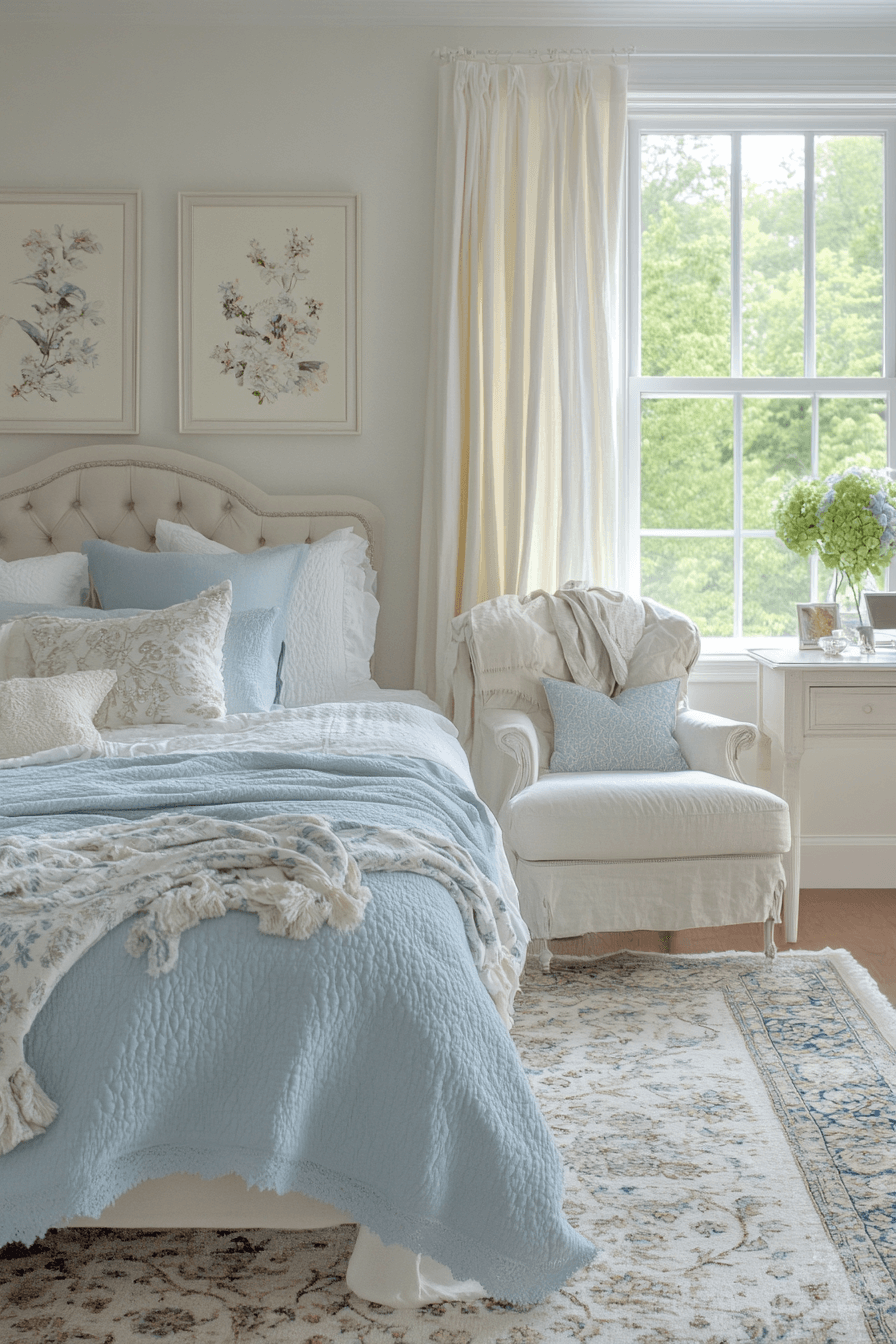 Light blue and ivory combine for a soothing, coastal-inspired escape that feels fresh year-round. The apartment aesthetic cozy atmosphere comes from breezy fabrics, woven textures, and open, uncluttered spaces. Soft patterns like subtle stripes or gentle florals add depth without overwhelming the simplicity. Bright accents, such as coral or sea-glass decor, keep the space feeling vibrant and balanced.