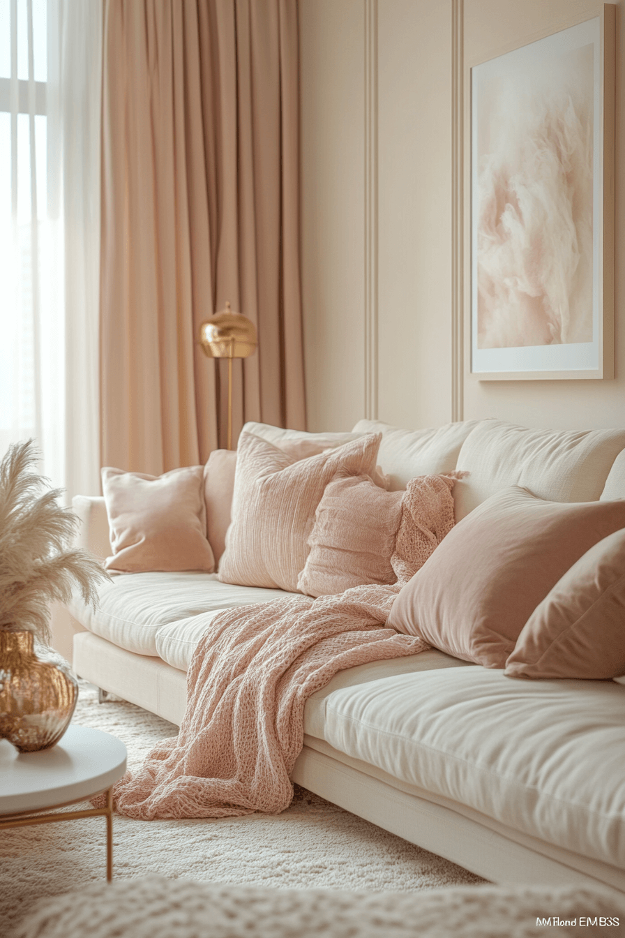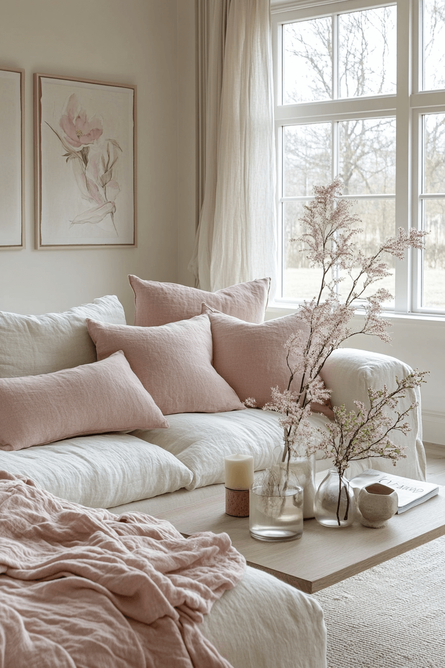 Pale blush and ivory bring a subtle elegance into the home, creating a space that feels romantic yet approachable. The apartment aesthetic cozy ambiance comes from pairing these soft tones with comfortable seating, light curtains, and inviting rugs. Delicate accents like floral arrangements or textured cushions add personality and warmth. Light fabrics keep the room airy while maintaining a welcoming charm.