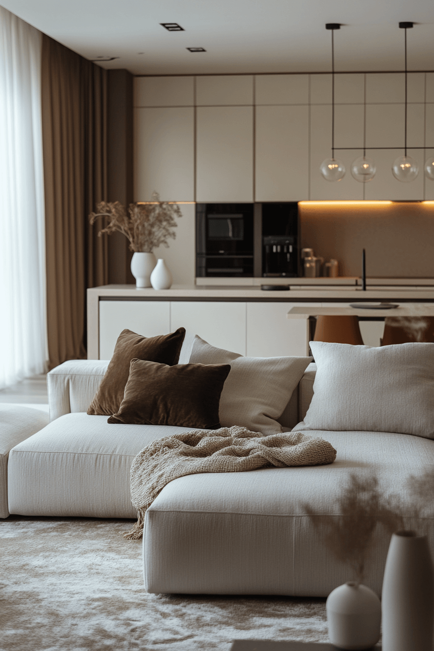 Modern design meets comfort in this soft-touch setup where style and function blend seamlessly. The apartment aesthetic cozy look is achieved with sleek lines, neutral upholstery, and plush throw pillows that invite relaxation. Neutral tones keep it versatile, working with both minimal and layered decor schemes. Warm lighting and a few personal accents enhance the inviting mood, making it feel truly like home.