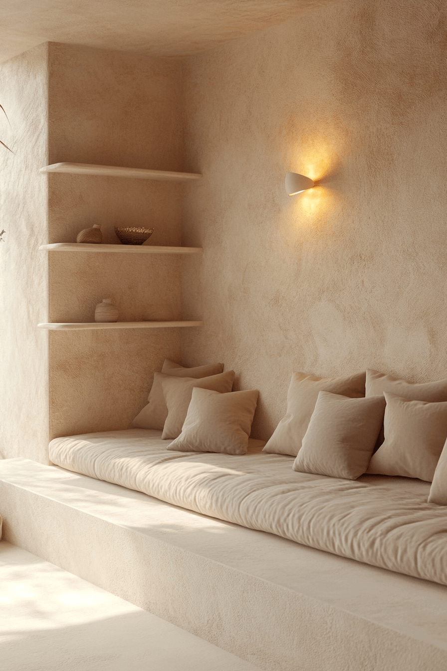 Beige layers add richness, warmth, and depth to a calm, inviting space that feels effortlessly stylish. The apartment aesthetic cozy feel comes from mixing fabrics like knits, cottons, and velvets with varying tones and finishes. Soft lighting from table lamps and candles enhances the golden glow, while minimal decor prevents visual clutter.