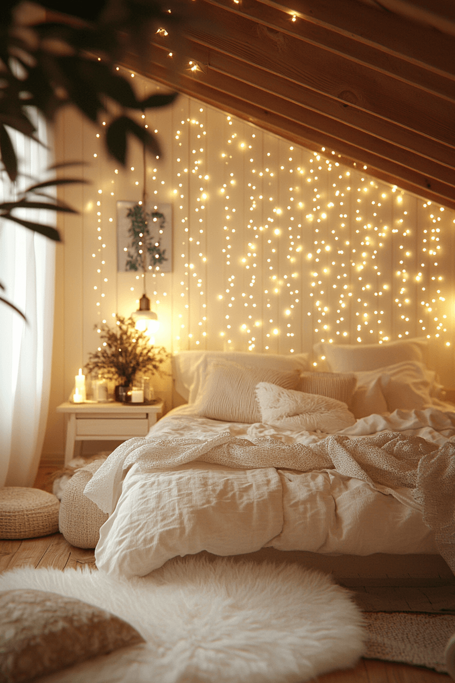 Dreamy lighting transforms even a simple room into a warm, welcoming escape you’ll never want to leave. This apartment aesthetic cozy design uses warm glows, soft textures, and layered lighting sources like string lights, table lamps, and sconces for maximum comfort. Neutral colors keep the space grounded and versatile. Thoughtful accents, such as candles or artwork, add extra charm and personality.