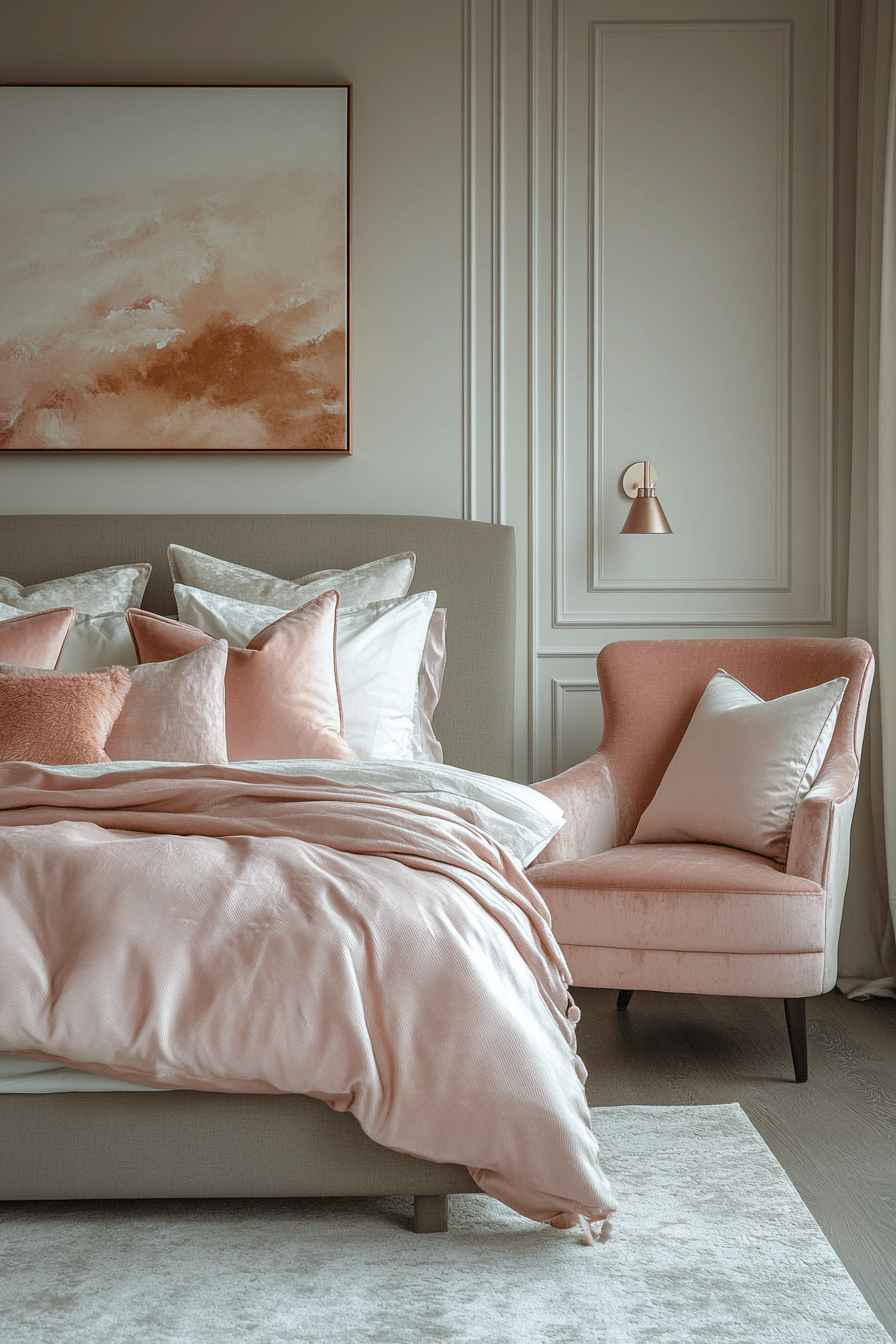 Soft pink and linen accents give the room a fresh yet elegant touch that feels both chic and comfortable. The apartment aesthetic cozy effect is enriched by warm lighting, textured fabrics, and gentle color transitions. Light furniture keeps the space airy, making it perfect for small apartments. The muted palette blends seamlessly with both modern and classic styles, offering versatility.