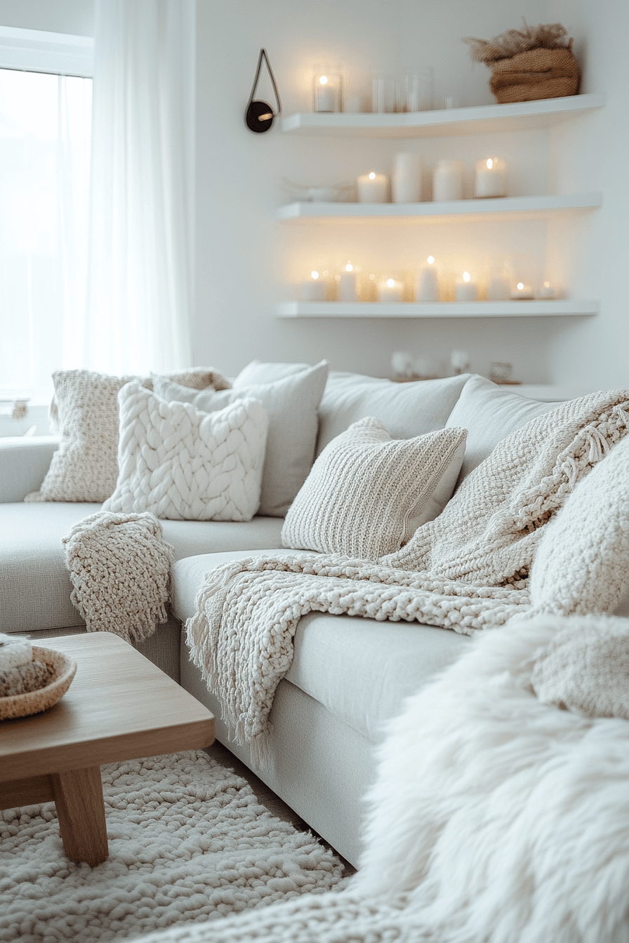 Sleek monochrome styling can still feel warm and inviting when balanced with thoughtful details. This apartment aesthetic cozy design uses texture-rich materials like knit throws and linen cushions, alongside layered lighting, to soften the crisp palette. Minimal accessories keep the focus on clean lines and open space. The result is effortlessly chic yet comfortable for everyday living.