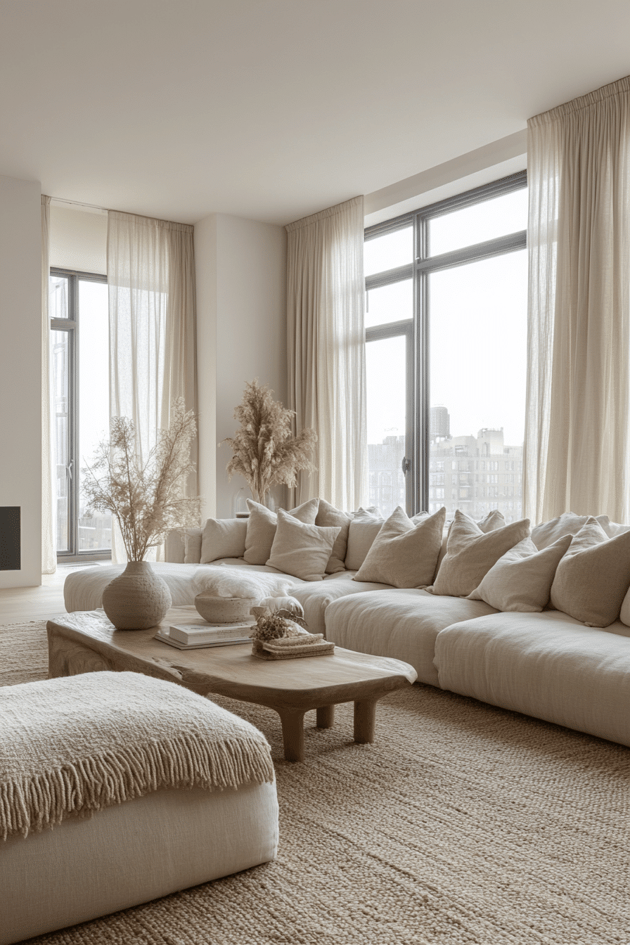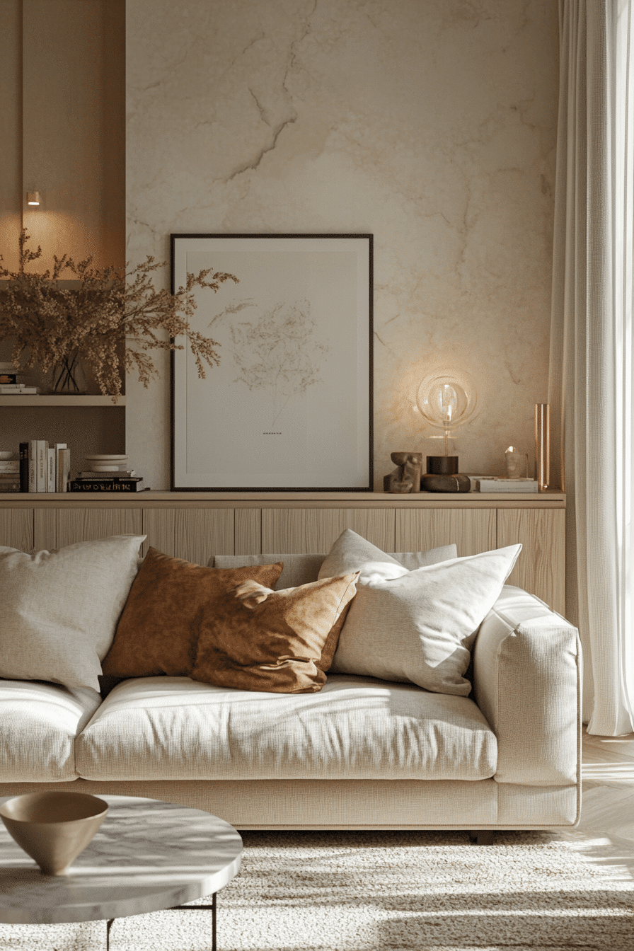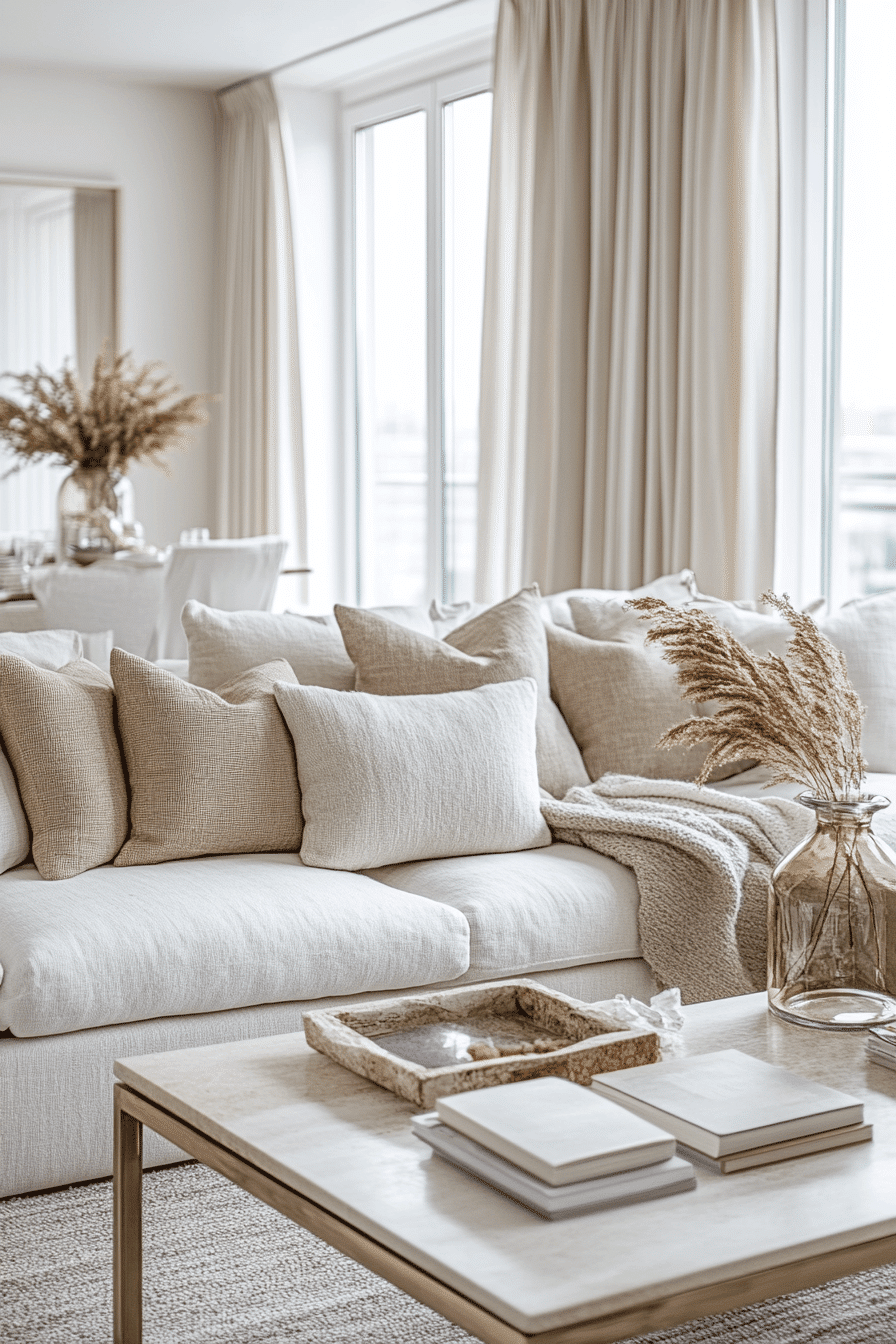 Soft tonal layers create apartment inspiration that feels calm, cohesive, and effortlessly elevated. Creams, warm ivories, and taupe shades blend seamlessly to form a soothing backdrop. Light-reflective surfaces help open up the space while keeping it warm. Plush textures like throws and rugs add comfort without heaviness. The result is a space that feels both airy and inviting. Bring this soft neutral look into your apartment and feel the calm instantly.