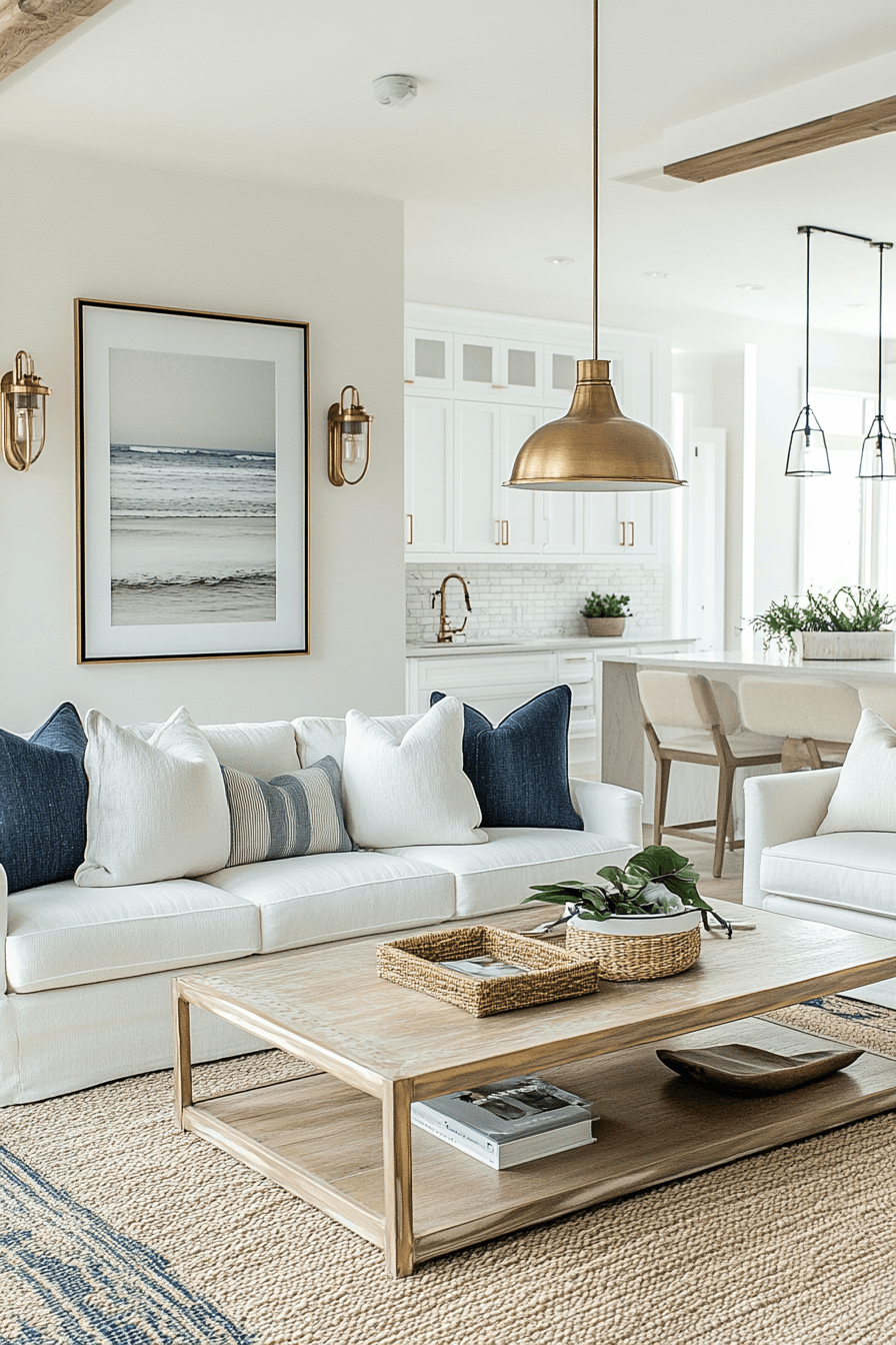 Refined coastal elements introduce subtle character into a beach house living room without going overboard. Hints of navy and metallic accents add contrast and interest. Clean lines keep the design modern and polished. The result feels timeless and elevated. It’s a fresh take on classic coastal style. Upgrade your beach house living room with this refined approach.
