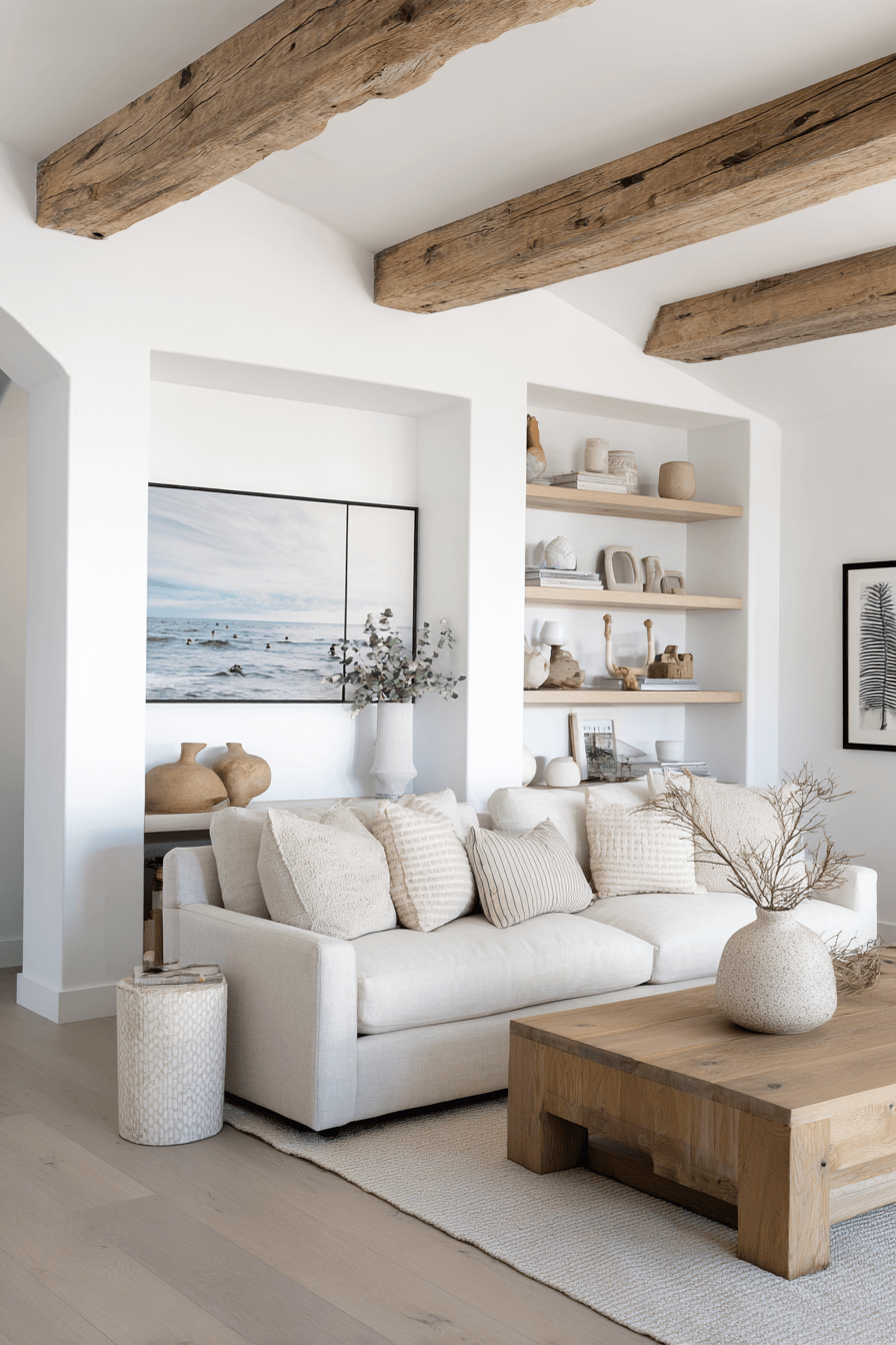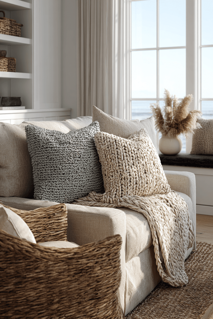Mixing materials adds dimension to a beach house living room while keeping the palette neutral. Soft fabrics, woven textures, and wood tones create depth. Each layer adds interest without clutter. The space feels warm and inviting. It’s a perfect balance of comfort and style. Add these layers and transform your beach house living room.