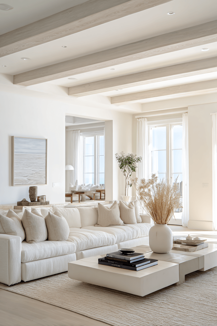Defined lines and simple structure bring clarity to a beach house living room without making it feel rigid. White tones and clean shapes keep the design fresh and open. Subtle textures prevent the space from feeling flat. The balance of modern and coastal elements works seamlessly. It feels organized yet still relaxed. Refresh your beach house living room with this structured simplicity.