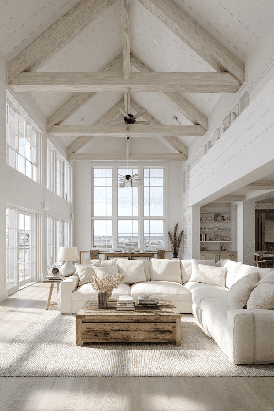 High ceilings and open space give a beach house living room a breezy, expansive feel. Large windows enhance natural light throughout the day. Soft textures keep the space comfortable despite its scale. The design feels airy yet inviting. It’s a perfect blend of openness and warmth. Try this layout and elevate your beach house living room.