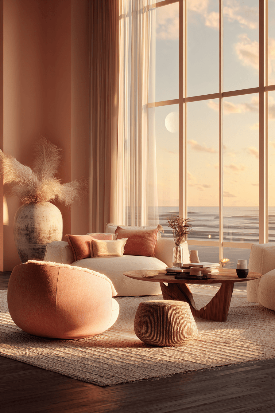 Warm hues inspired by coastal sunsets bring a soft glow into a beach house living room. Blush and coral tones add warmth without heaviness. The palette feels vibrant yet calming. Lighting enhances the golden atmosphere. The space becomes both cozy and uplifting. Introduce these sunset tones and refresh your beach house living room.